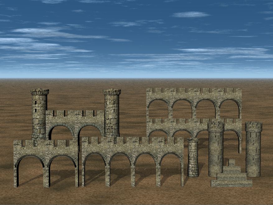 SET PORTALE UND BOGENWÄNDE. (OBJ Format) Set enthält Burgtürme, Portale und Bogenwände. Geeignet für Burgen, Schlößer, Römische Brücken und Aquedukte. Montiert und konvertiert mit Bryce7. (Texturen beigefügt)