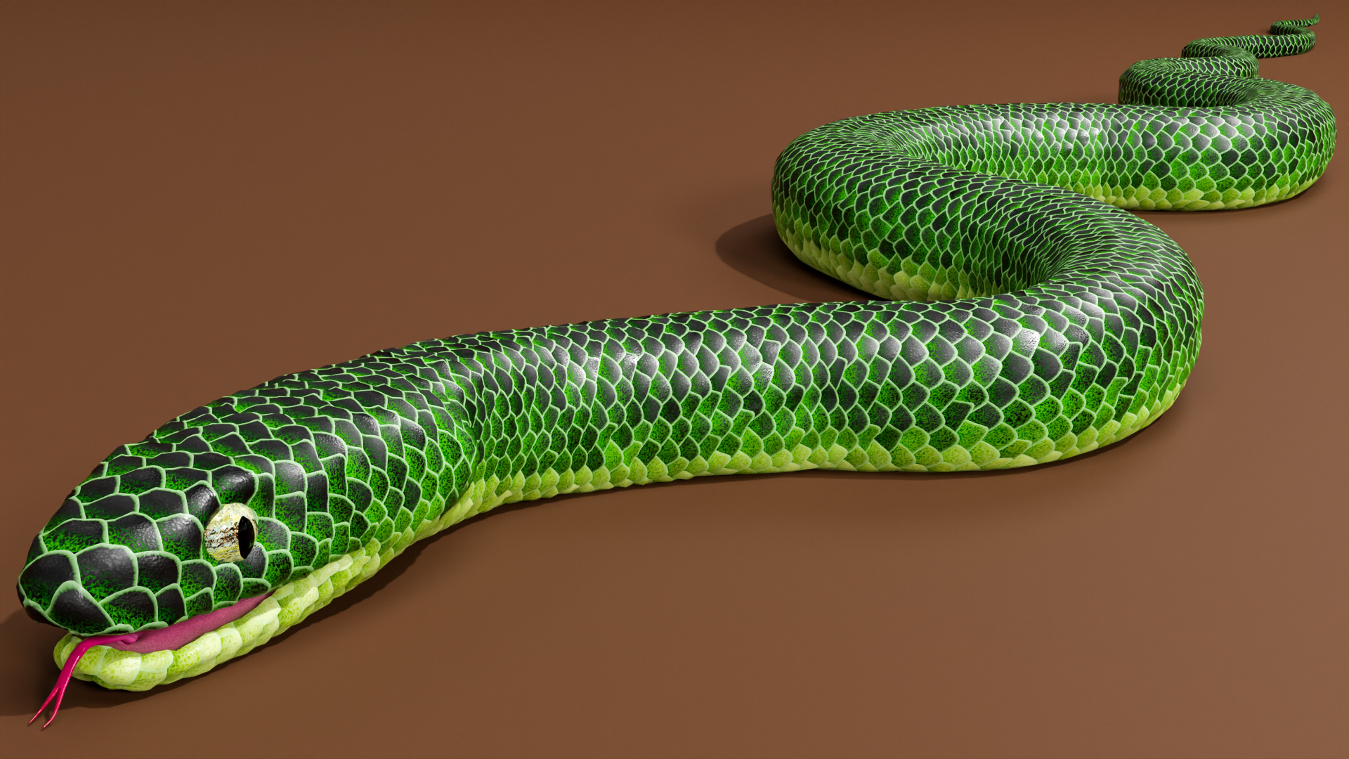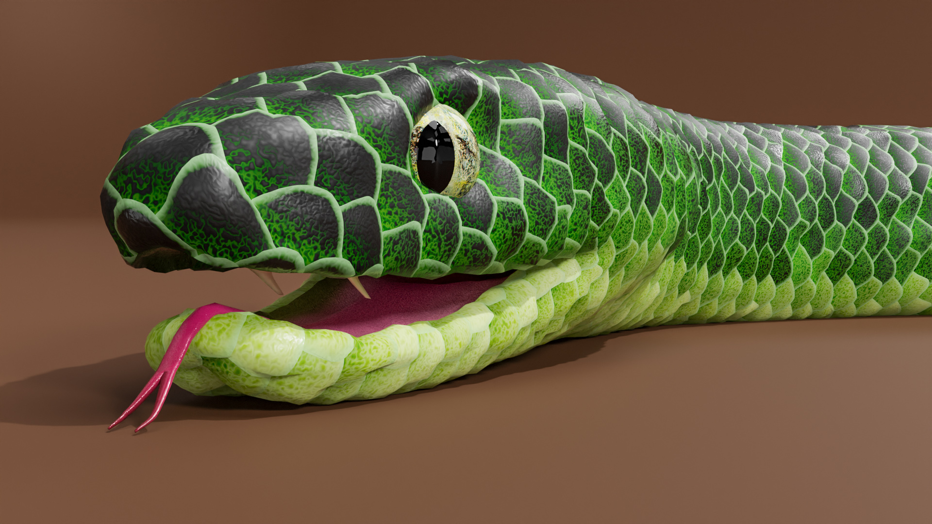 Die Schlange ist voll geriggt, auch die Zähne. 4 Posen habe Ich bereits in der Posen Bibliothek hinterlegt auch eine Reset Pose zum Bearbeiten.