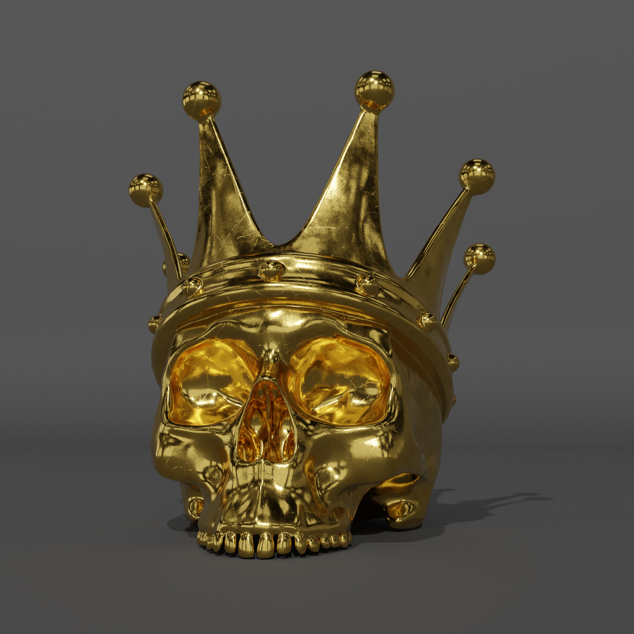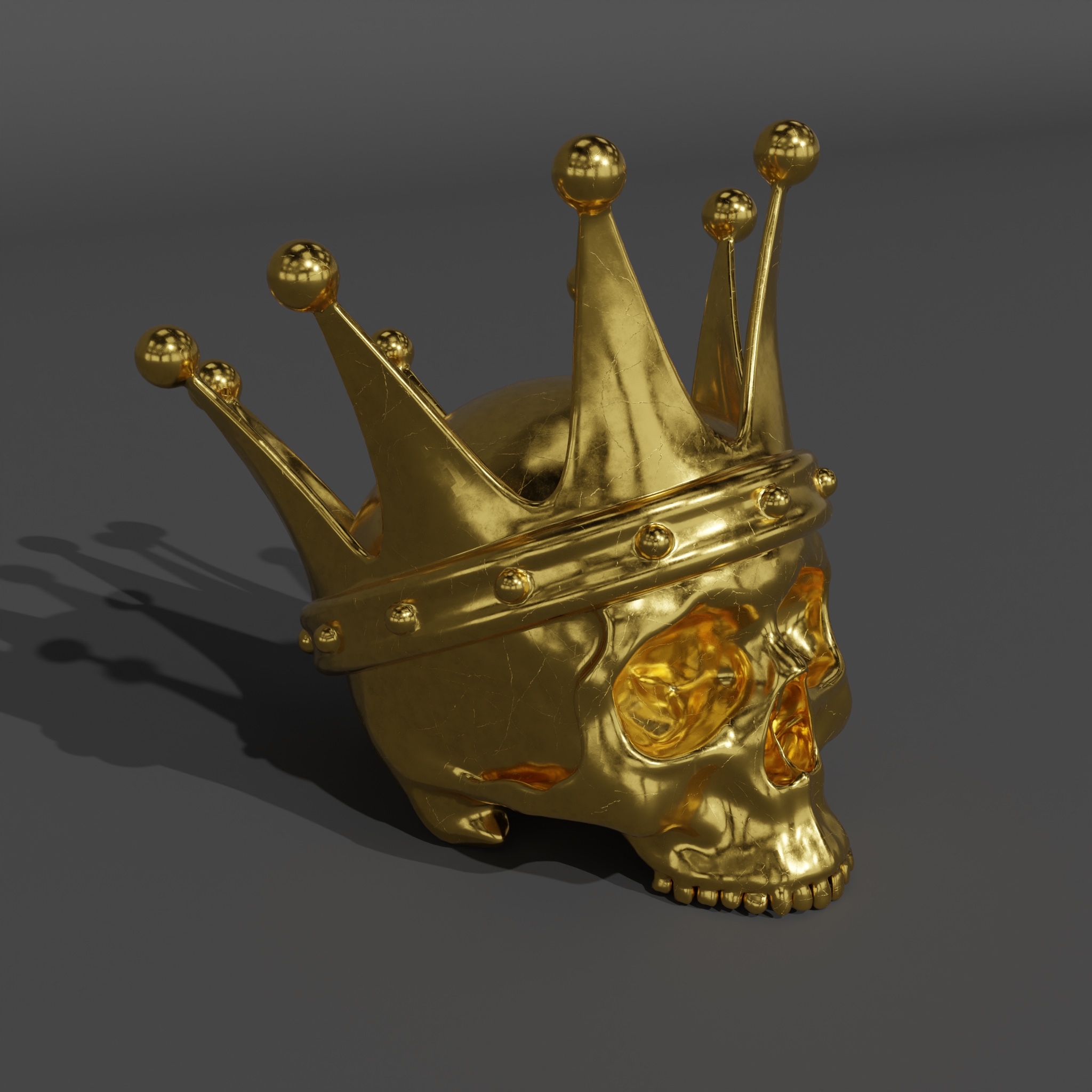 ein goldener Totenschädel mit Krone, ein passendes Geschenk für jeden Spieler und goth. ich wünsche dir viel spaß mit dem Blender Modell und mögen deine scenen gelingen.