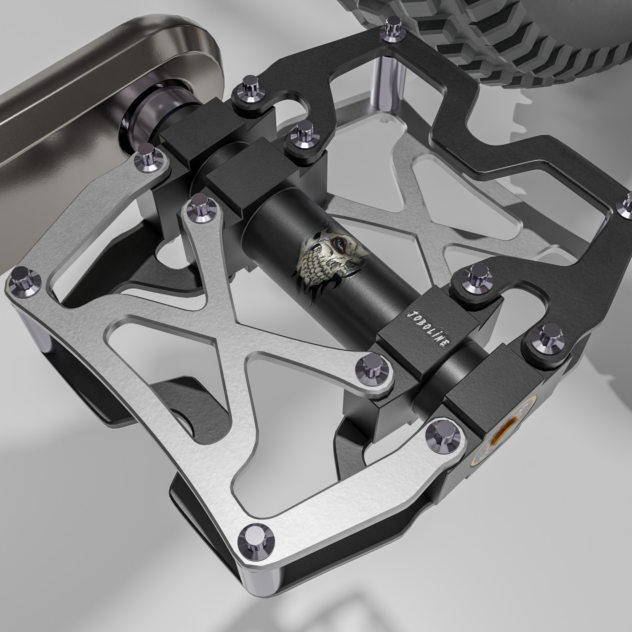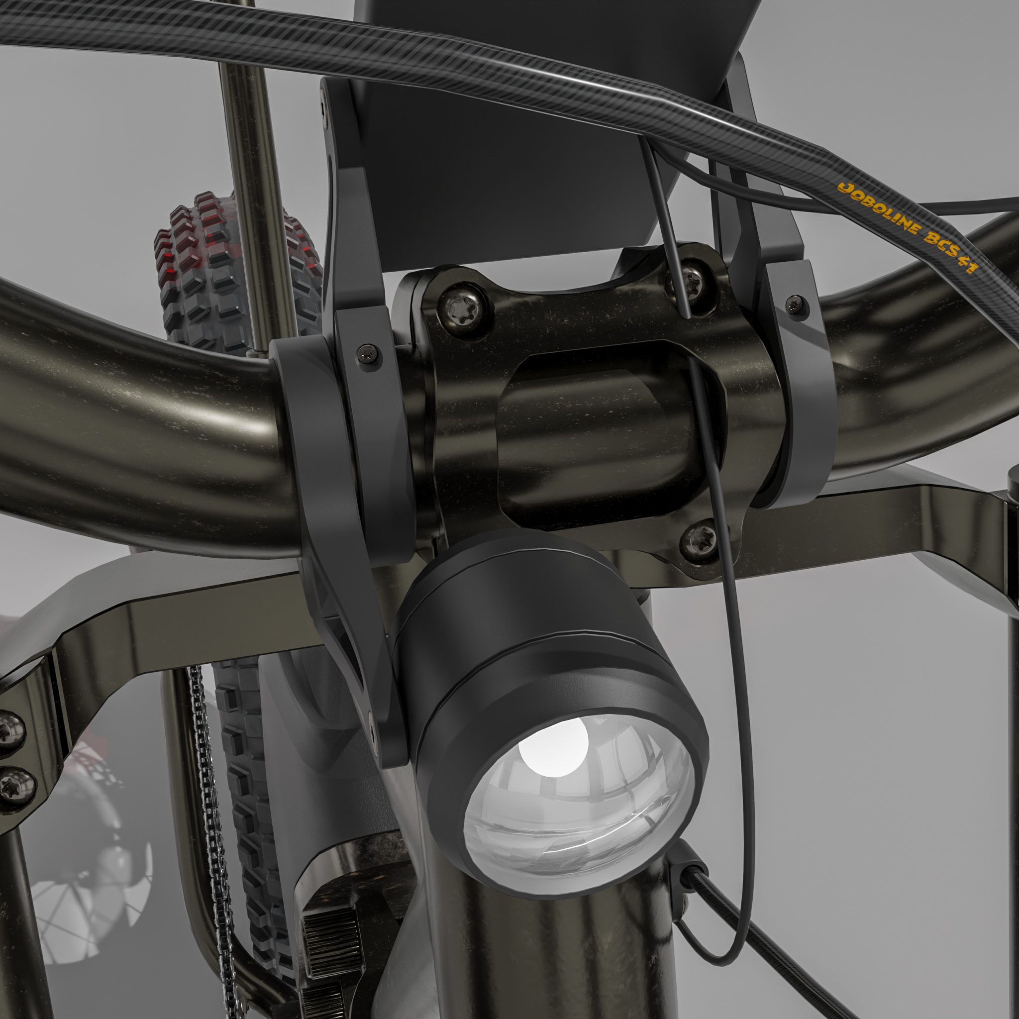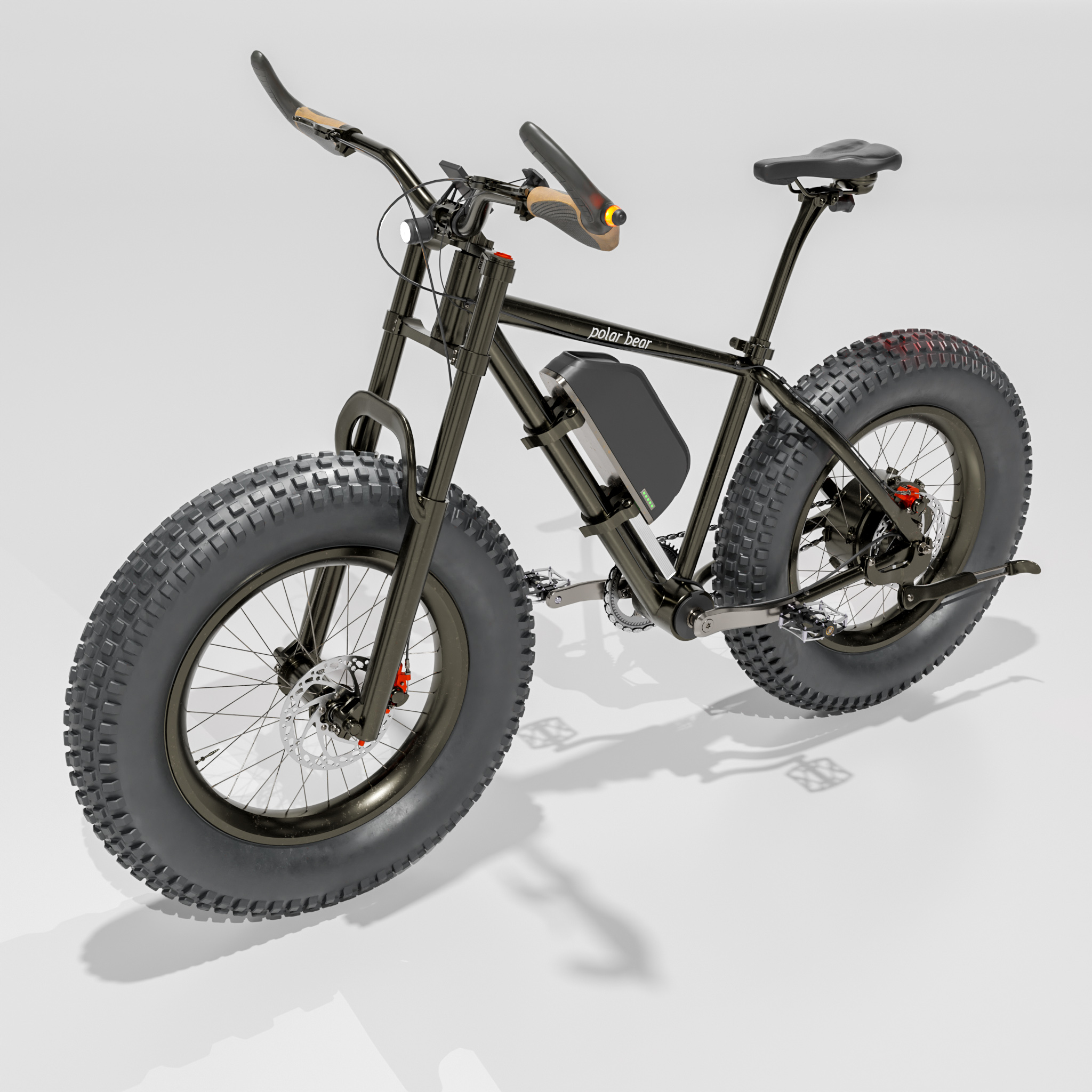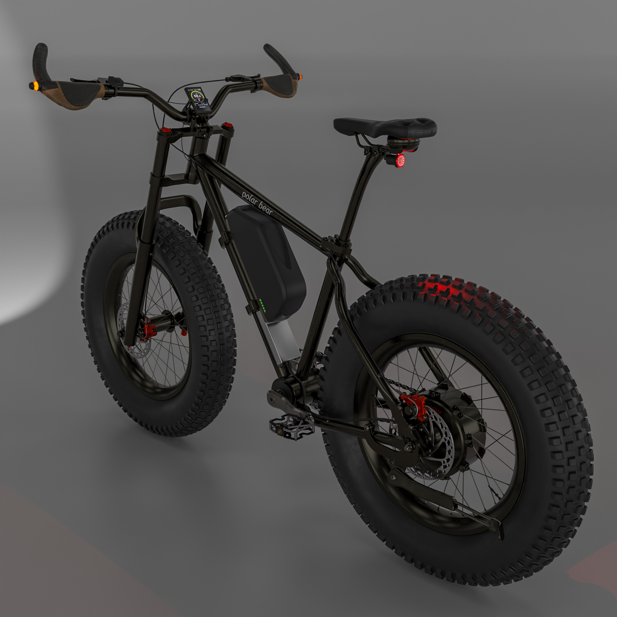 Dieses Fatbike ist speziell für schwer befahrbare Schneestrecken und Pisten konstruiert. Mit seinen 29 x 5.0 Zoll Reifen, die jeweils 70 grobe Stollen pro Reihe aufweisen, und seinem 1000 Watt Hecknabenmotor bietet es besonders viel Traktion und Vorschub. Das Singlespeed-Rad verzichtet aufgrund seines starken E-Motors auf eine aufwendige Kettenschaltung und ist somit extrem wartungsarm. Es ist mit einem extra breiten Lenker und speziellen Lenkgriffen ausgestattet, die eine leichte Manövrierbarkeit im schwierigen Gelände ermöglichen. Die Kurbelarme, Pedale, Kette und Reifen stehen in Bewegungsabhängigkeit und sind kinderleicht zu animieren. Achtung: Durch die groben Stollen neigen die Räder in einer Animation dazu, scheinbar rückläufig zu drehen (Plattenspieler-Effekt). Bitte passe deine Animationsgeschwindigkeiten und Bildwiederholraten entsprechend an. Die Lenksäule (Vorderrad, Gabel, Lenker und Seilzüge) stehen ebenfalls in Bewegungsabhängigkeit und können mit dem Empty-Objekt "fork" bewegt werden. Zum Drehen der Reifen bzw. des Antriebsstranges rotiere bitte die Kurbelarme. Der Seitenständer ist auch beweglich und für eine Fahrzeugneigung von 10° ausgelegt. Bitte benutze für deine Modellmanipulationen und Animationen die Transformations-Orientierung "local". Ich wünsche dir viel Spaß mit dem Blender-Modell und mögen deine Szenen gelingen.