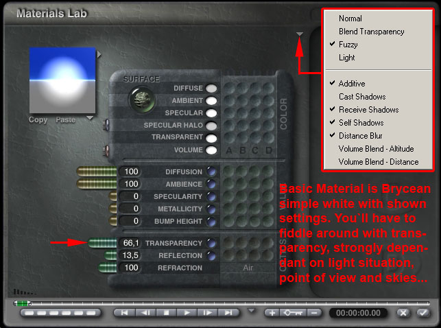 Einstellungen für das Bryce MatLab siehe beiliegendes .jpg "Bryce Settings". Basismaterial ist das Standardweiss. Je nach Hintergrund und Einsatzzweck erfordert es etwas Fingerspitzengefühl, ergibt aber sehr gute Ergebnisse...