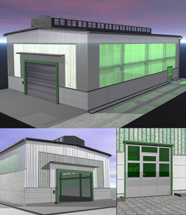 Das Rolltor kann alternativ in hochgefahrenem Zustand dargestellt werden, so dass Einblick ins Halleninnere möglich ist.