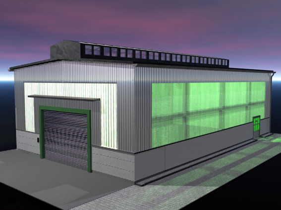 Modell einer beleuchteten Lagerhalle mit halbtransparenten Fiberglaswandsegmenten, Bryce 5 Objekt (obp)