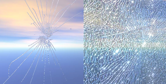 10 zerbrochene Glasscheiben, inklusive 1 Einschuss-Loch (negative Boole-Form) für die Windschutzscheibe etc.