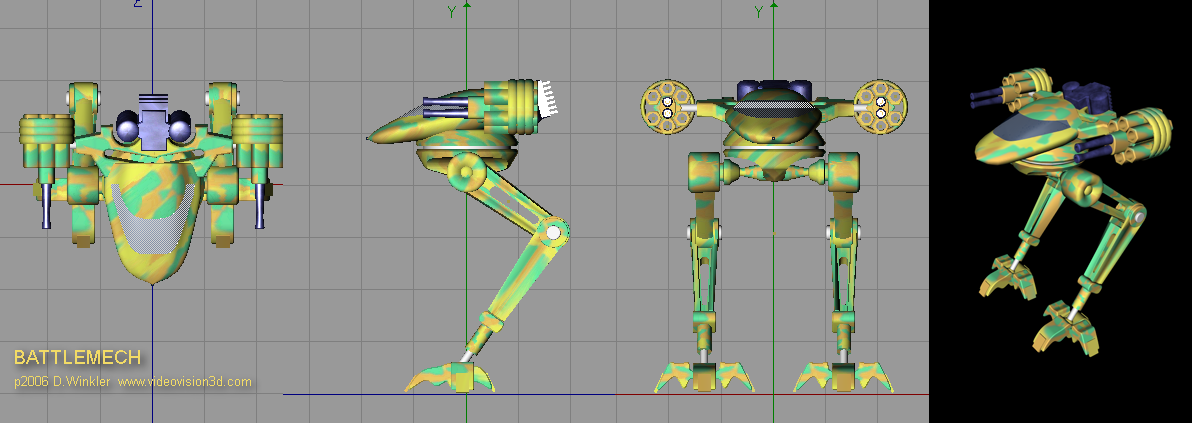 Dieser Battlemech besitzt durchweg eine Objekthierarchie, die für alle Teile eine sinnvolle Animation ermöglichen. Als Beispiel könnt Ihr hier diese kleine Animation direkt herunterladen: http://www.videovision3d.com/8410/battlemech.avi