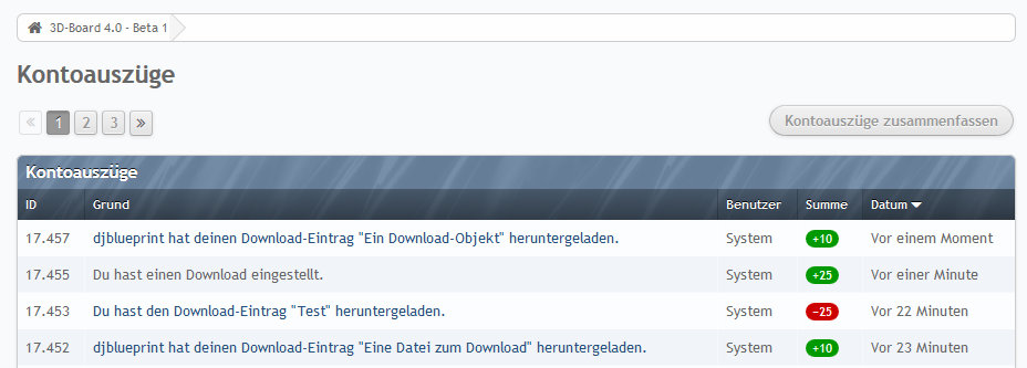 Die Einträge in die Kontoauszüge enthalten jetzt für den Uploader die Anzeige des Usernamens des Downloaders, bei Uploader und Downloader den Namen des Download-Eintrags und sind im Falle eines Downloads sowohl bei Uploader als auch bei dem Downloader mit der jeweiligen Übersichts-Seite des Download-Eintrags verlinkt.* NEW Feature: