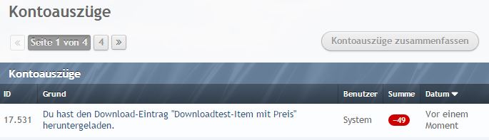 - Die Einträge in die Kontoauszüge enthalten für den Uploader die Anzeige des Usernamens des Downloaders. Sowohl Uploader als auch Downloader wird der Name des betroffenen Download-Eintrags angezeigt. Die Einträge sind im Falle eines Downloads sowohl bei Uploader als auch bei dem Downloader mit der jeweiligen Übersichts-Seite des Download-Eintrags verlinkt (siehe Screenshot).