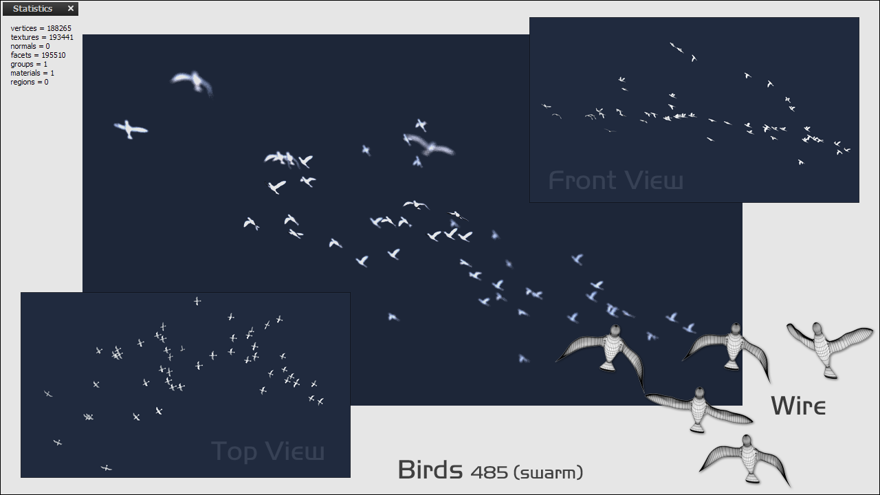 Ist dafür jedoch relativ hochpolygon (knapp 200.000), ginge definitiv auch weit sparsamer. Habe schon 'unwichtigere' Teile *hust* wie Schnabel und Augen entfernt, um ein paar Polys einzusparen. (Deshalb auch nicht wirklich für nähere Distanzen geeignet.) War allerdings ursprünglich auch nicht für diese Größenordnung gedacht, da eigentlich ein in C4D6 animiertes Einzelobjekt, das hier ver-Partikel-emittiert wurde.