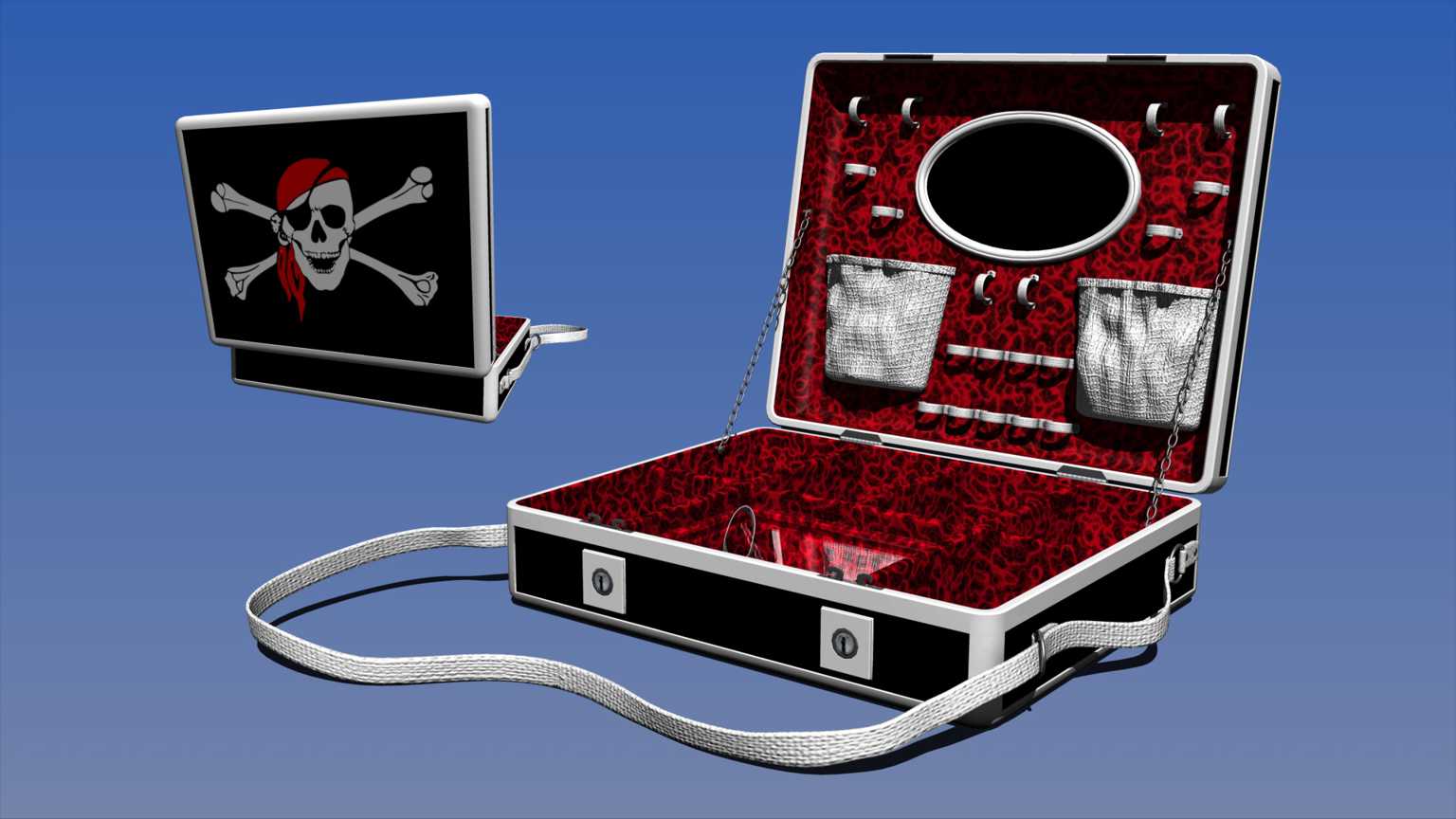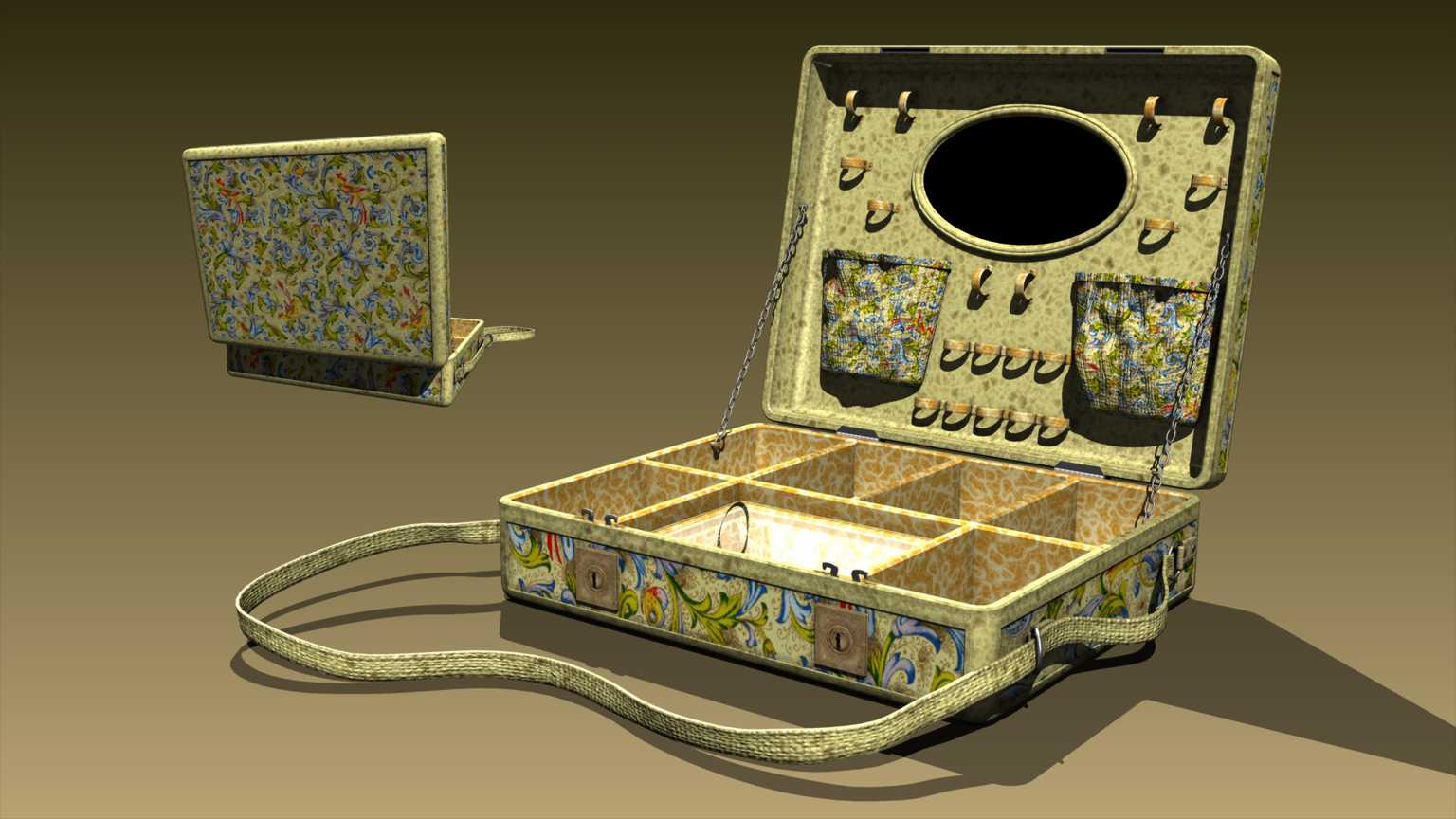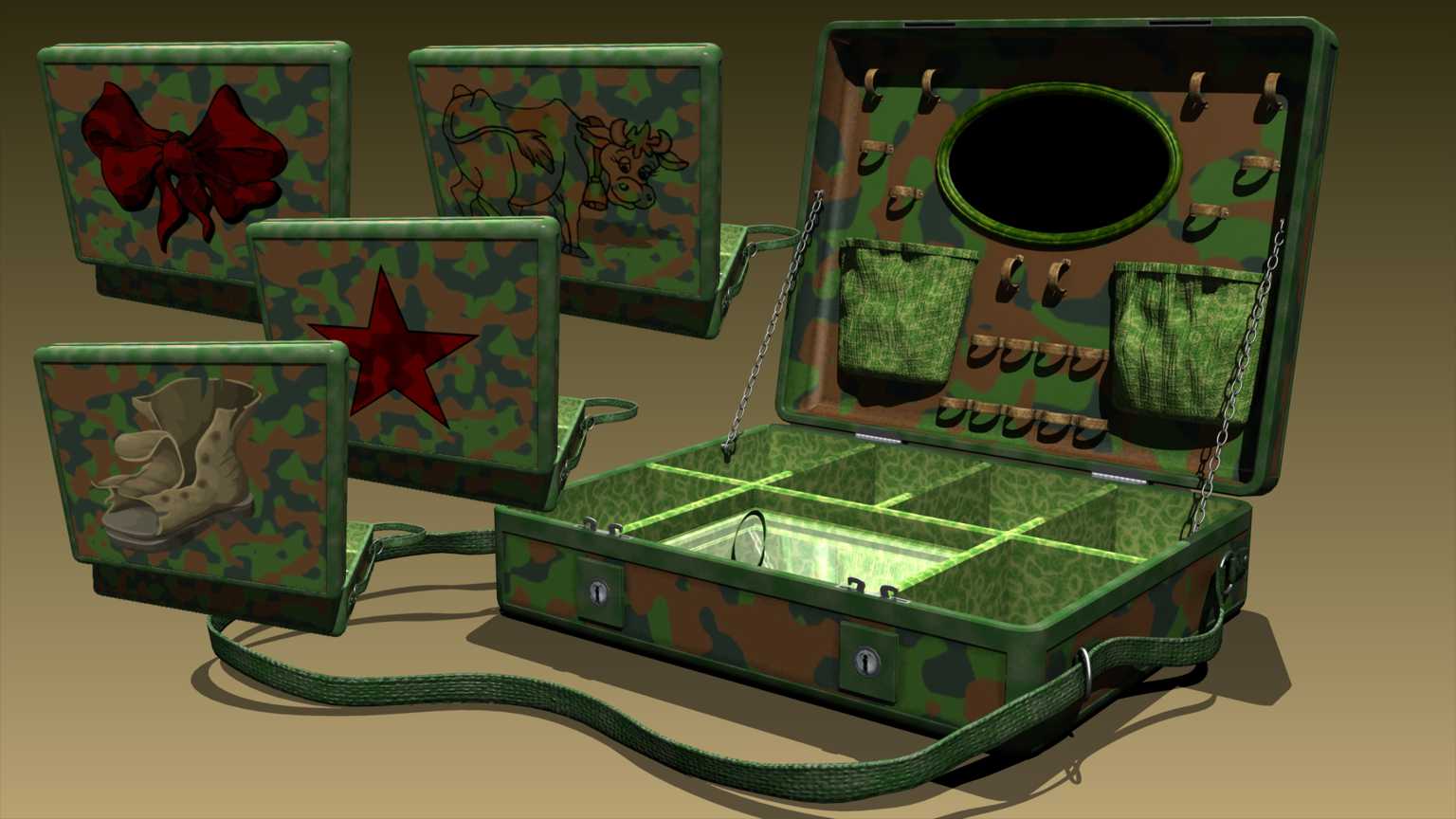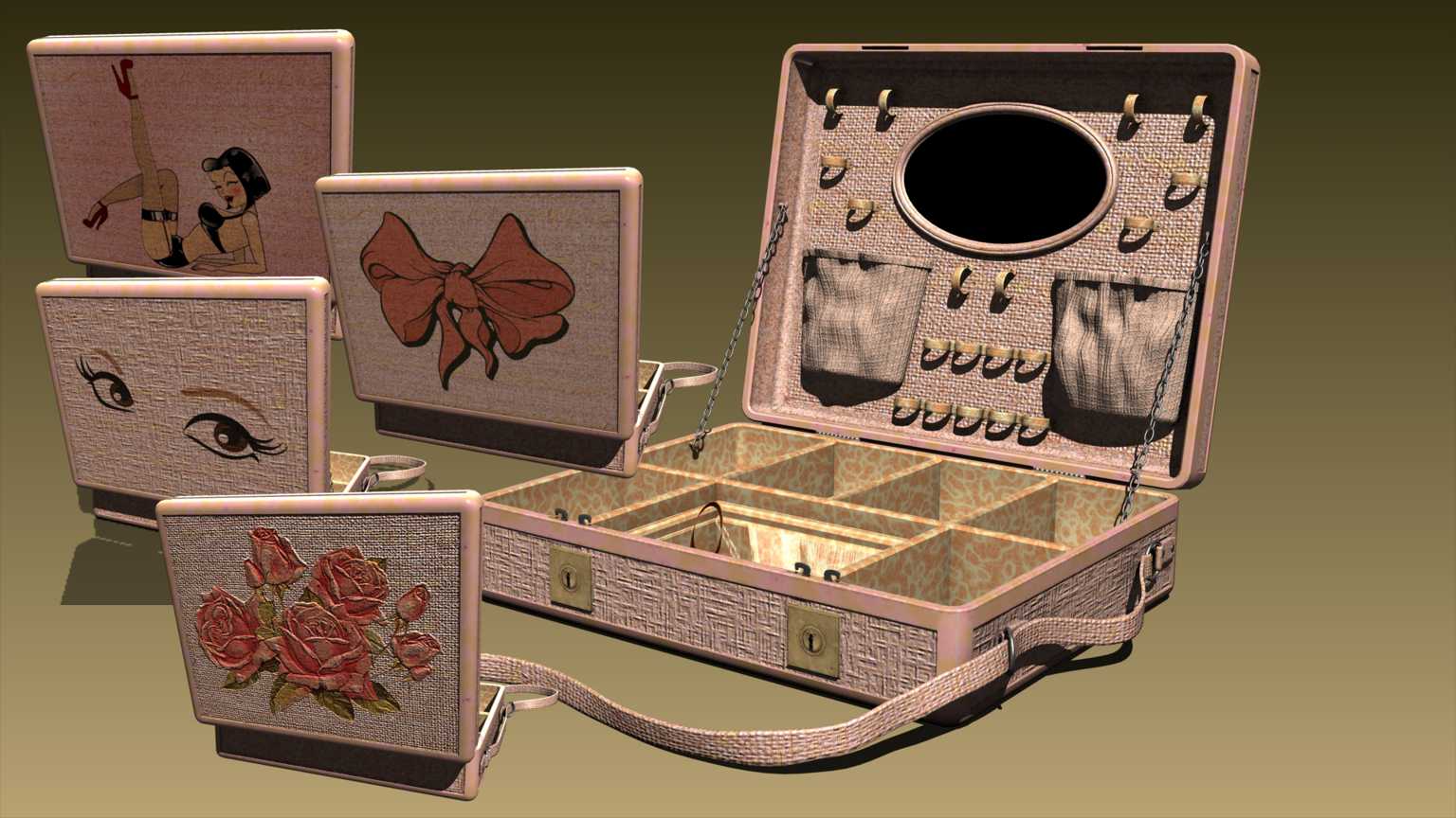 Bei der OBJ-Datei müssen die Texturen von Hand nachgeladen werden. Der Koffer kann teilweise demontiert werden, so das die Oberschale ohne Objektfüllung dargestellt werden kann. Die Unterschale ist nur gering veränderbar. Der Koffer lässt sich in zwanzig verschiedene Texturvarianten darstellen. Texturauflösung 1024 x 1024 pixel.