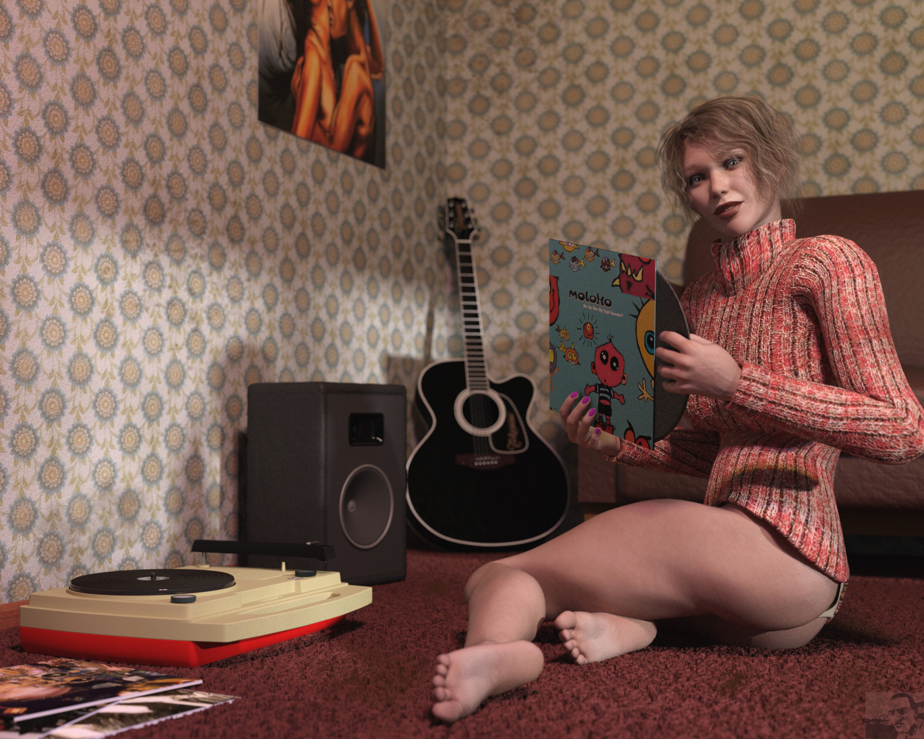• Das Plattenspielermodell ist voll retro und passt perfekt zum Teppich, der Tapete und dem Strick-Pulli. :) Nur Moloko ist im Verhältnis vielleicht etwas zu modern.