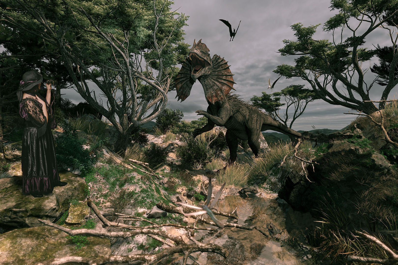 die unerschrockene Saurierflüsterin hat sich wieder auf Zeitreise begeben und diesen Dilophosaurus entdeckt. Ansich wäre es ja gefährlich sich solchen Exemplaren zu nähern . Doch die Erfahrung und das wissen das man über einen Schutzschild verfügt lassen doch einiges mehr zu. Wer mit t-Rex zurecht kommt wird dies kleine Exemplar wohl auch im Auge behalten können.