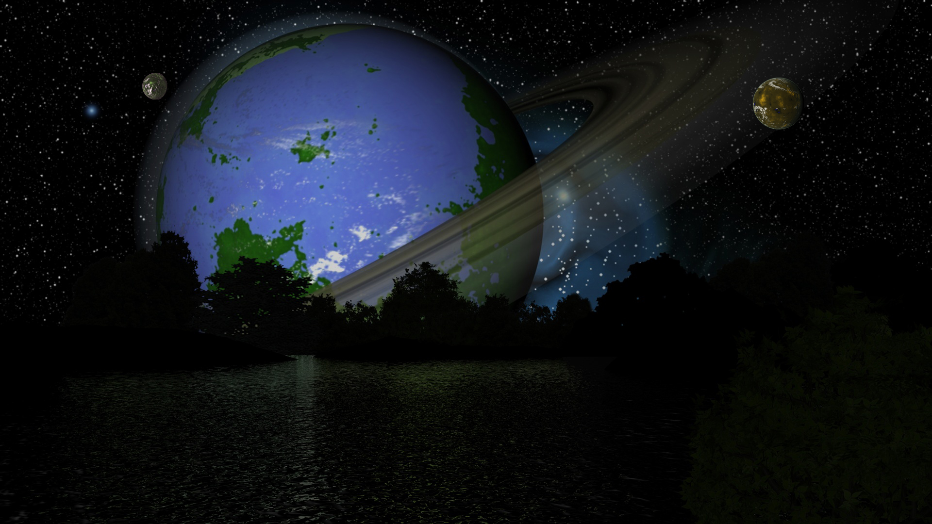 Der Blick vom Mond Grachus aus zeigt den Riesenplanet Orpheus mit den Monden Ira (links oben) und Zejus (auf der rechten Seite).