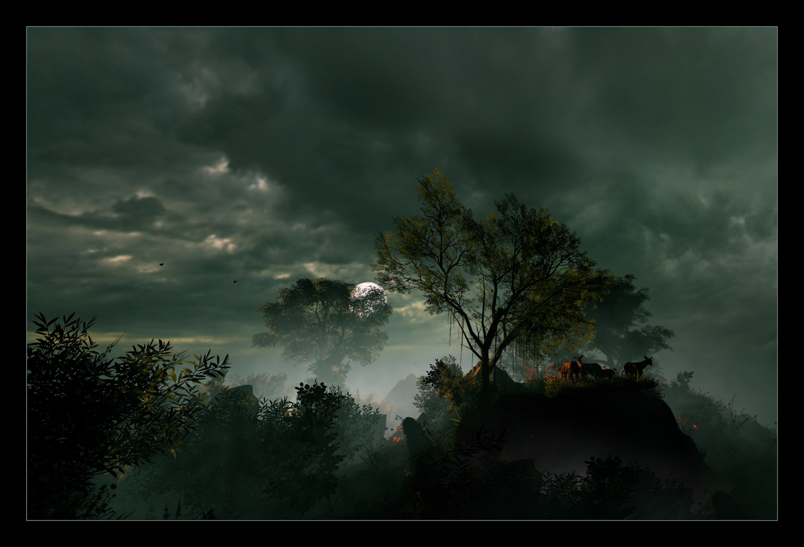 Der persönliche Fingerabdruck Deiner Kunst zeigt sich in den farblichen Lichthöfen, die das Auge durch dezent-warme Farbtöne zum Wesentlichen lenken - in diesem Fall eine Gruppe von Rehen, die ohne den wohl-platzierten Spot mit den Schatten verschmelzen würden. So schafft es auch dieses Bild trotz Bewölkung eine angenehme verträumte Stimmung zu produzieren. [So, oder ähnlich würde ich es als Autor eines Versteigerungskatalogs formulieren. ;)] Es mit den Werken von Casper David Friedrich zu vergleichen, empfinde ich zudem als passend, wenn auch unfair, denn der alte Meister besaß nicht die technischen Möglichkeiten, die das CGI heutzutage bietet. Seine Spots waren zudem nicht zielführend wie bei Dir, sondern eher darauf ausgelegt, mit Farben und Pinsel einen Realismus zu erzeugen, der erst viel später durch Fotokammeras ermöglicht wurde. Deine Bilder gehen imho in die Richtung einer retrospektiven Romantik mit wie gesagt Wohlfühlspots. Vergleiche z.B. "https://www.meisterdrucke.com/kunstdrucke/Caspar-David-Friedrich/858912/Nordsee-im-Mondlicht.html" mit ähnlicher Wetterlage, allerdings mit "abgesoffenen" Farben und ohne erkennbaren Fixpunkt, wenn man mal von der Schatten-Silhouette des Fischerbootes absieht. Es ist zwar eine bewundernswerte Handwerkskunst, allerdings viel zu unfixiert im Gegensatz zu Deinen Bildern, in denen Du mit Licht und Farbe die Fixierung des Betrachters selbst bestimmst. "Postmoderne Romantik"? Vielleicht, und warum auch nicht(?) Also 2:0 für Dich im Gegensatz zum toten Casper.