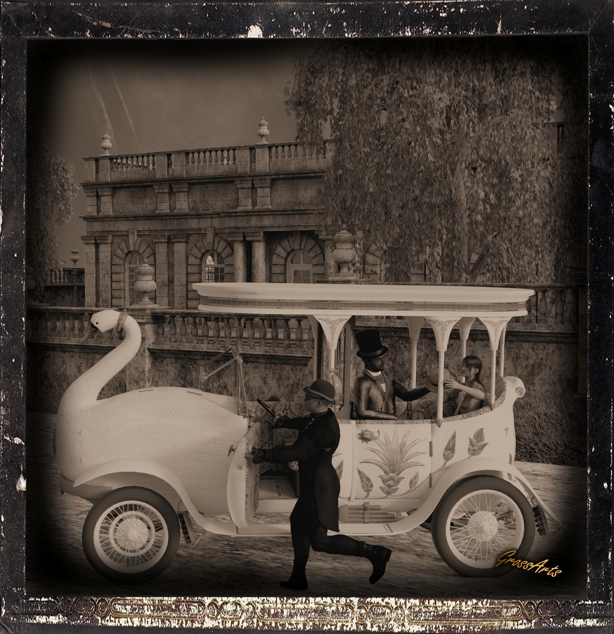Der "Elegant Swan" basiert auf dem 1910er Brooke Swan Car. Dieses einzigartige und exzentrische Fahrzeug wurde für einen in Indien lebenden Schotten entwickelt. Es enthielt eine Pfeifenorgel im Fahrgastraum, und der Mund des Schwans öffnete sich und spuckte heißen Dampf aus, um die überfüllten Straßen zu räumen. Es kackte tatsächlich auch eine joghurtähnliche Substanz. Nachdem die Polizei das Auto als Bedrohung deklariert und von der Straße verbannt hatte, kaufte der Maharaja es für seine persönliche Autosammlung.