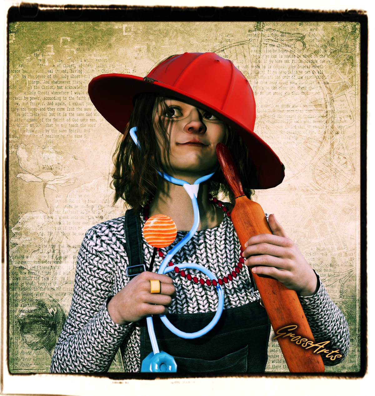 Obwohl ... bei genauerer Betrachtung des gasplanetenfarbenen Lollis und der hintergründigen Konstruktionszeichnung eines Hochrades könnte es auch sein, dass sie Ingenieurin im Fertigungshangar der Froggynator werden möchte. Als einzige Bioeinheit unter wuselnden Frogbots. Ok, ich lade sie gerne mal zu einem Schnupperpraktikum ein, denn die Konstruktionsvorbereitungen haben grad erst begonnen ... Spricht sie Froggisch oder kann sie mit einem Universalübersetzer umgehen? Das wäre von Vorteil.