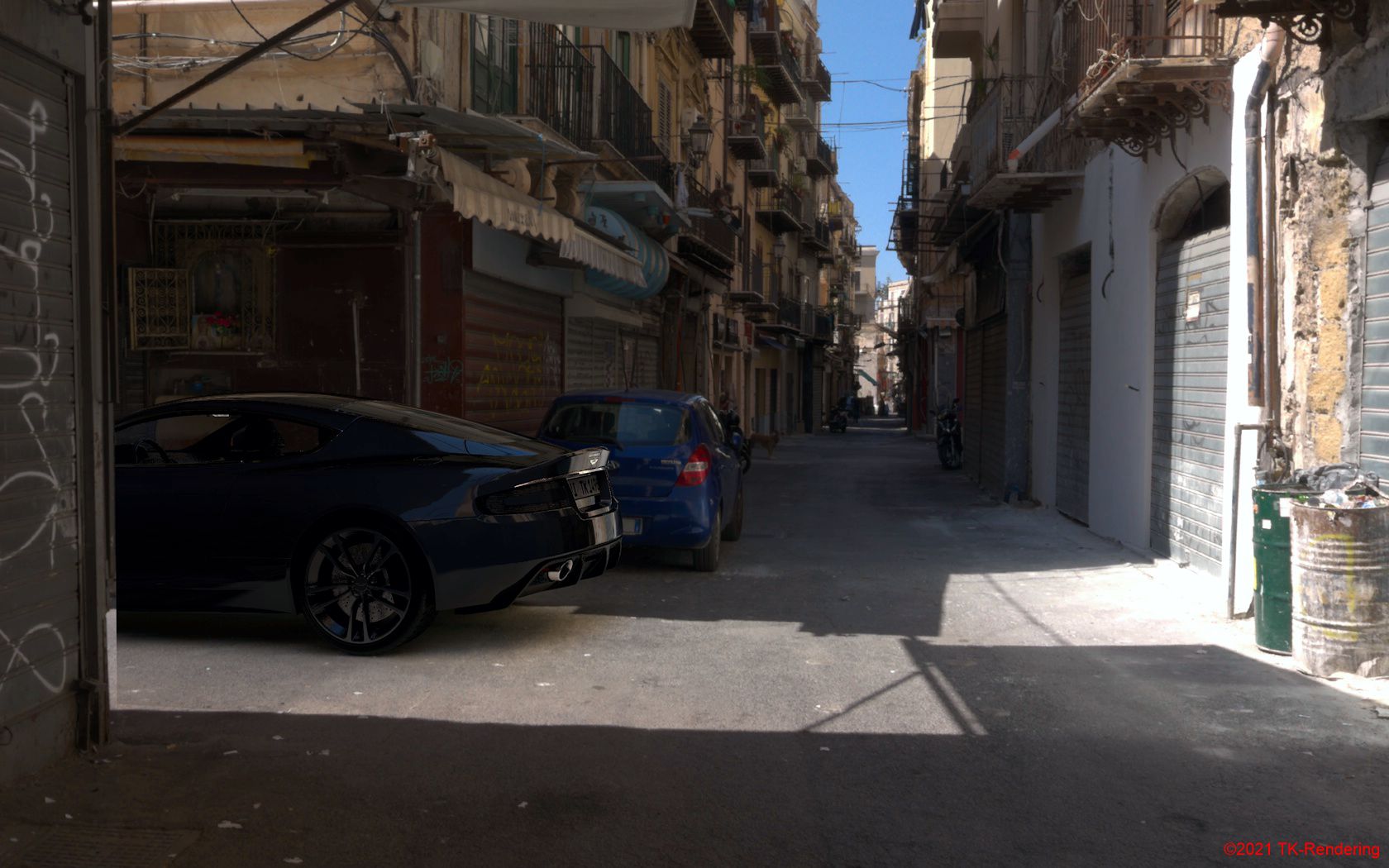 Da solltest Du noch einmal über den Schattenwurf des Aston nachdenken. Der ist zu weich im Vergleich zu den Häuserschatten. Wenn Du das Problem löst, ist das Bild sehr gut.
