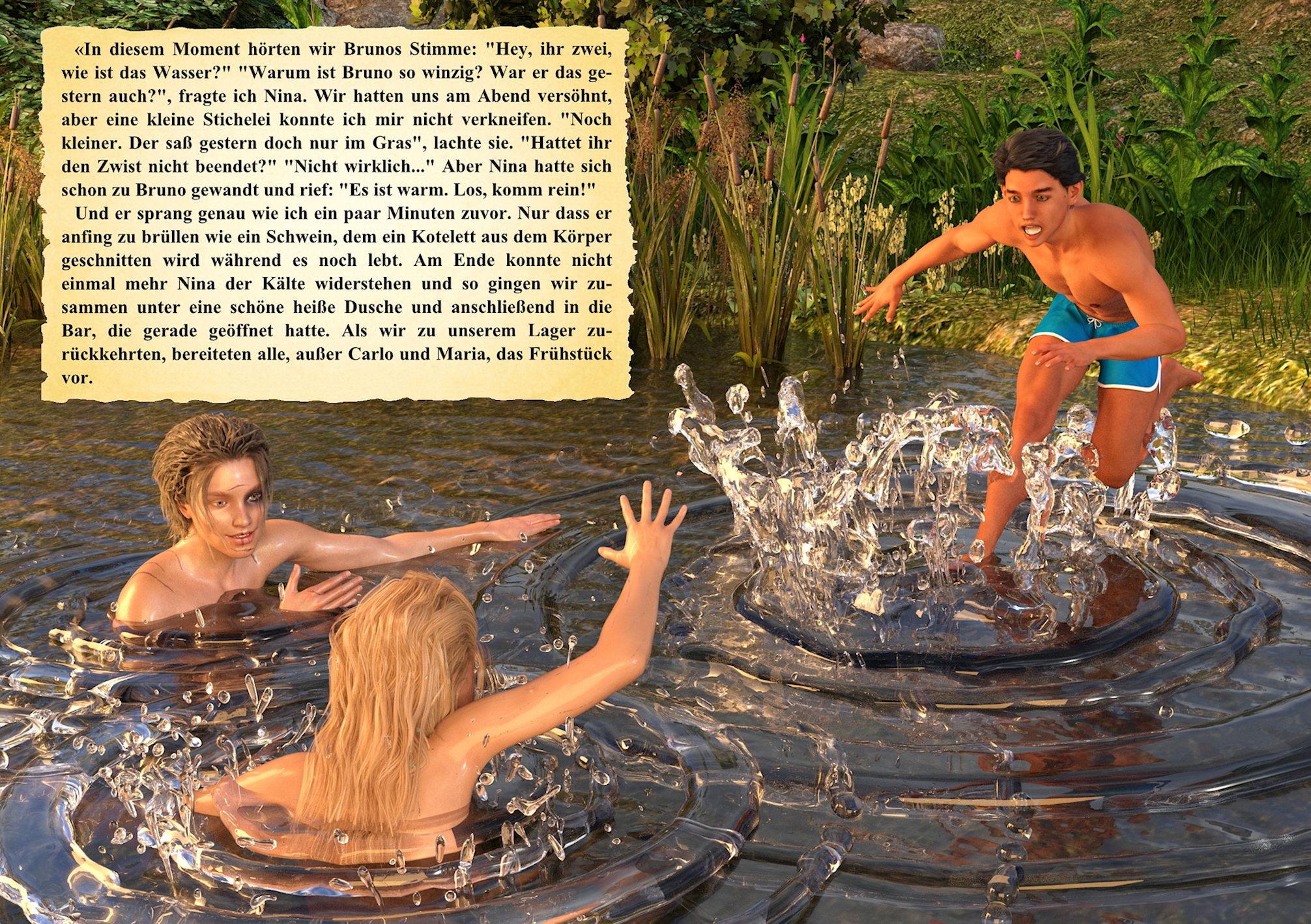 Mein Sohn, dessen Geschichtn ich bebilder, ist gerade in Mailand und hat bemäkelt, dass die Spritzer um den ins Wasser hüpfenden Jungen zu hoch sind und die Wasserspritzer um die Schwimmer keinen Sinn machen. Wenn er nicht mehr zu meckern hat... diese Fehler lassen sich schnell ausbügeln.
