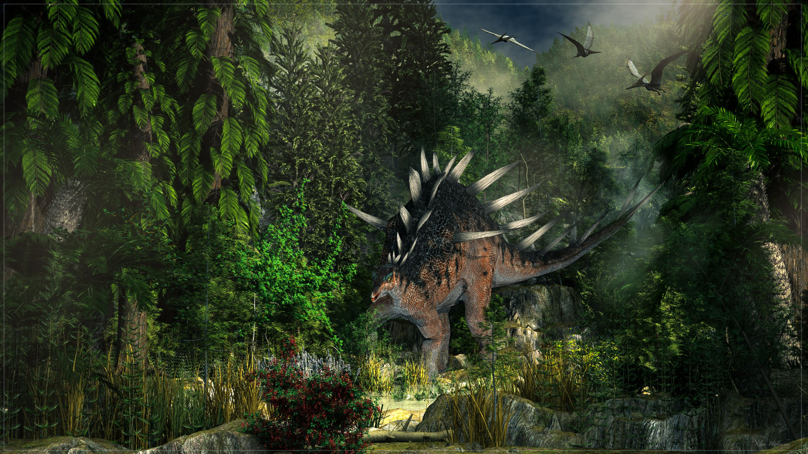 Das ganze wurde wieder in Carrara gemacht Der Dino und die Großen Prähistorischenbäume im Vordergrund kommen von Daz. Alle anderen sind von Carrara . Für den Hintergrund wurden mehr als 80 000 Bäume Repliziert. Tolles Teil der Replikator.