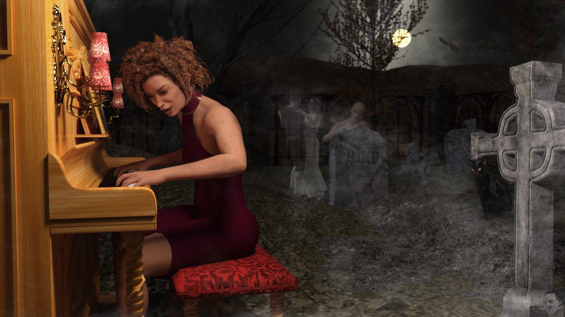 Oder sie merkt gar nichts davon. Oder das passiert nur in ihrer Phantasie... ist ja auch total unrealistisch, mitten in der Nacht auf einem Friedhof Klavier zu spielen!