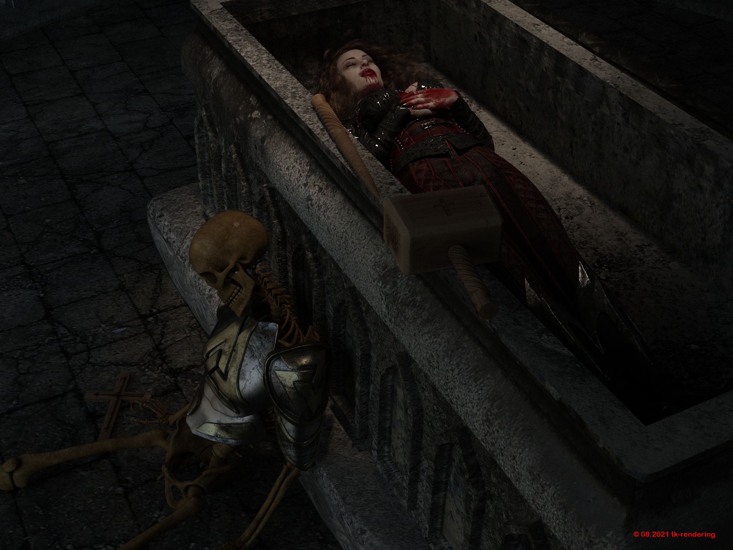 • Super gemacht! Anscheinend ist rechts der Ausstieg aus dem Sarg, sonst hätte sie die Werkzeuge längst vom Sargrand gekegelt. Und ein wenig unvorsichtig ist sie schon, die da so frei zur Verfügung für einen weiteren Vampirjäger liegen zu lassen