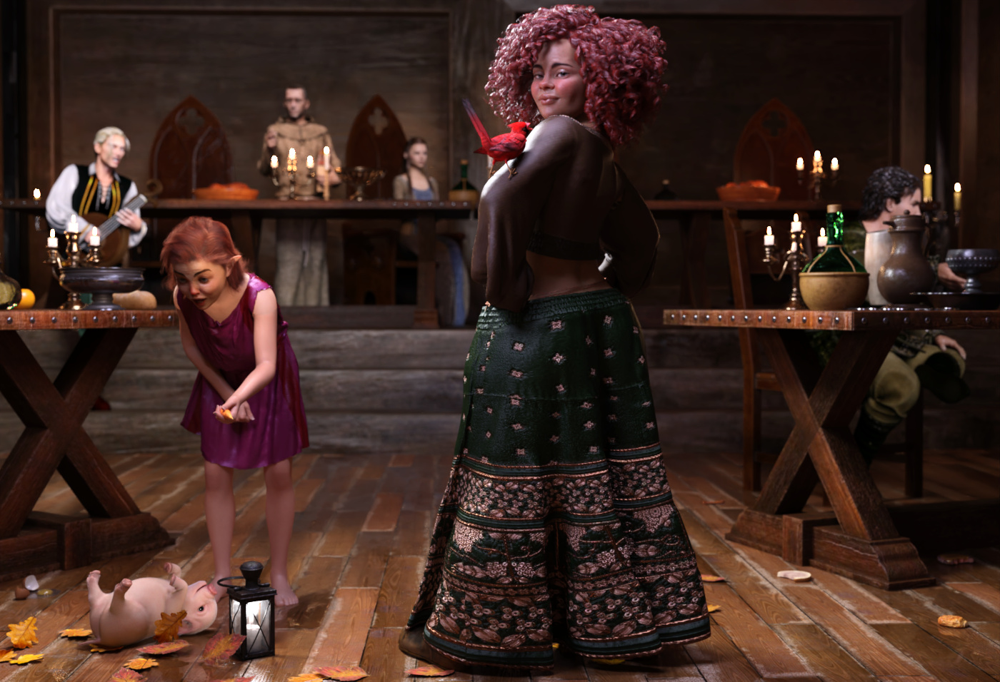 Wunderschönes Kleid der Frau mit dem tollen Rock. Lustig finse ich das heruntergefallene Spanferkel. Da kriege ich direkt Hunger