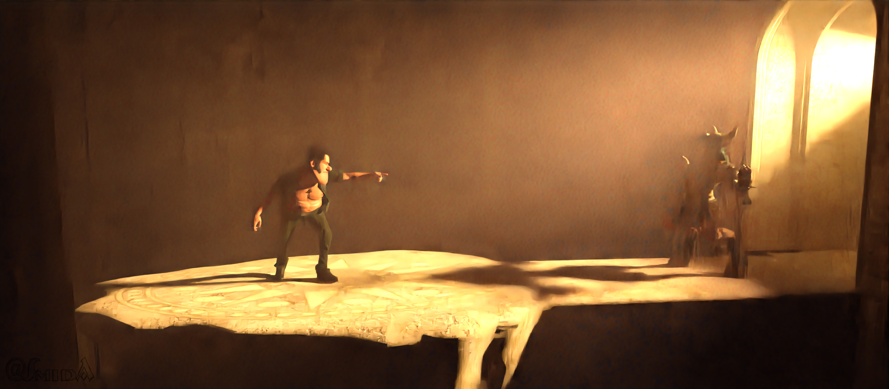 Für einen kleinen Beleuchtungsworkshop mit Iray (DAZ) habe ich eine kleine Szene aufgelegt. Ziel war es, so eine Art Godray-Effekt zu erzielen, indem Licht nur durch einen kleinen Spalt in die Szene fällt, die mit einem lichtbrechenden Volumen gefüllt war.