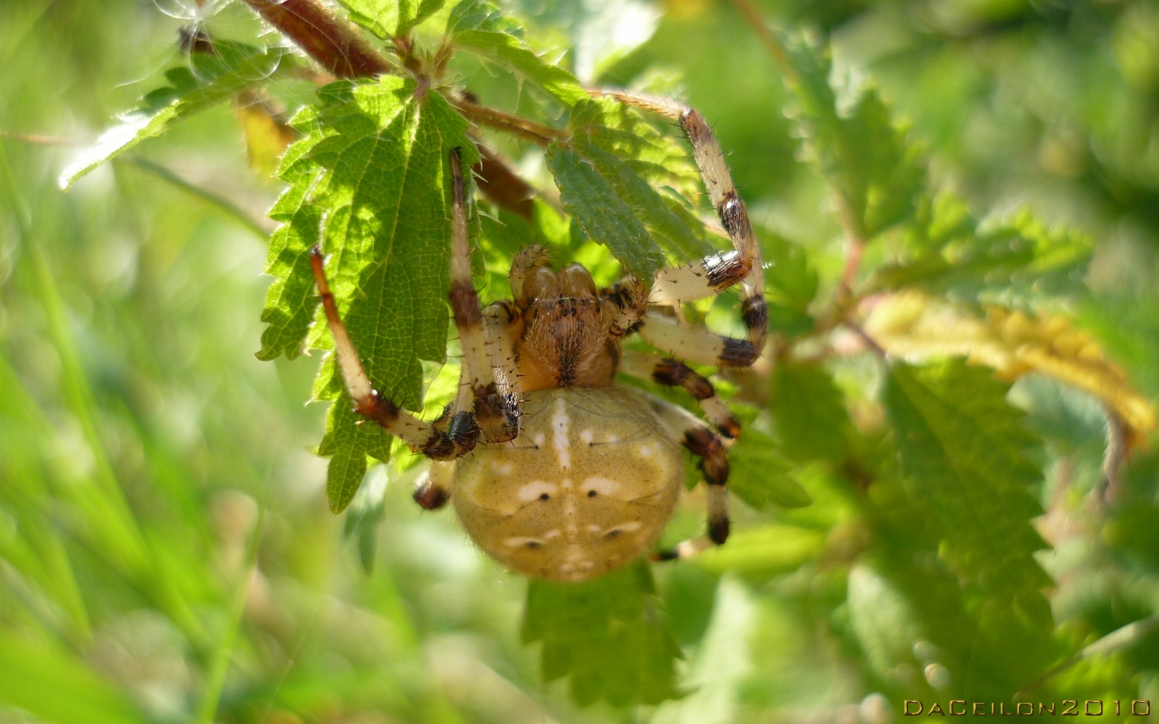 Leider weiß ich die Gattung nicht. Die Spinne hatte ungefähr die Größe von 1,5 cm und hing in einem niedrigen Strauch in der Wiese. Die Kammera hatte einen Abstand von ca. 7 cm und war frei mit der Hand gehalten. Nach 7 Anläufen hatte ich dan dieses Bild. Das Bild ist nicht nachbearbeitet!