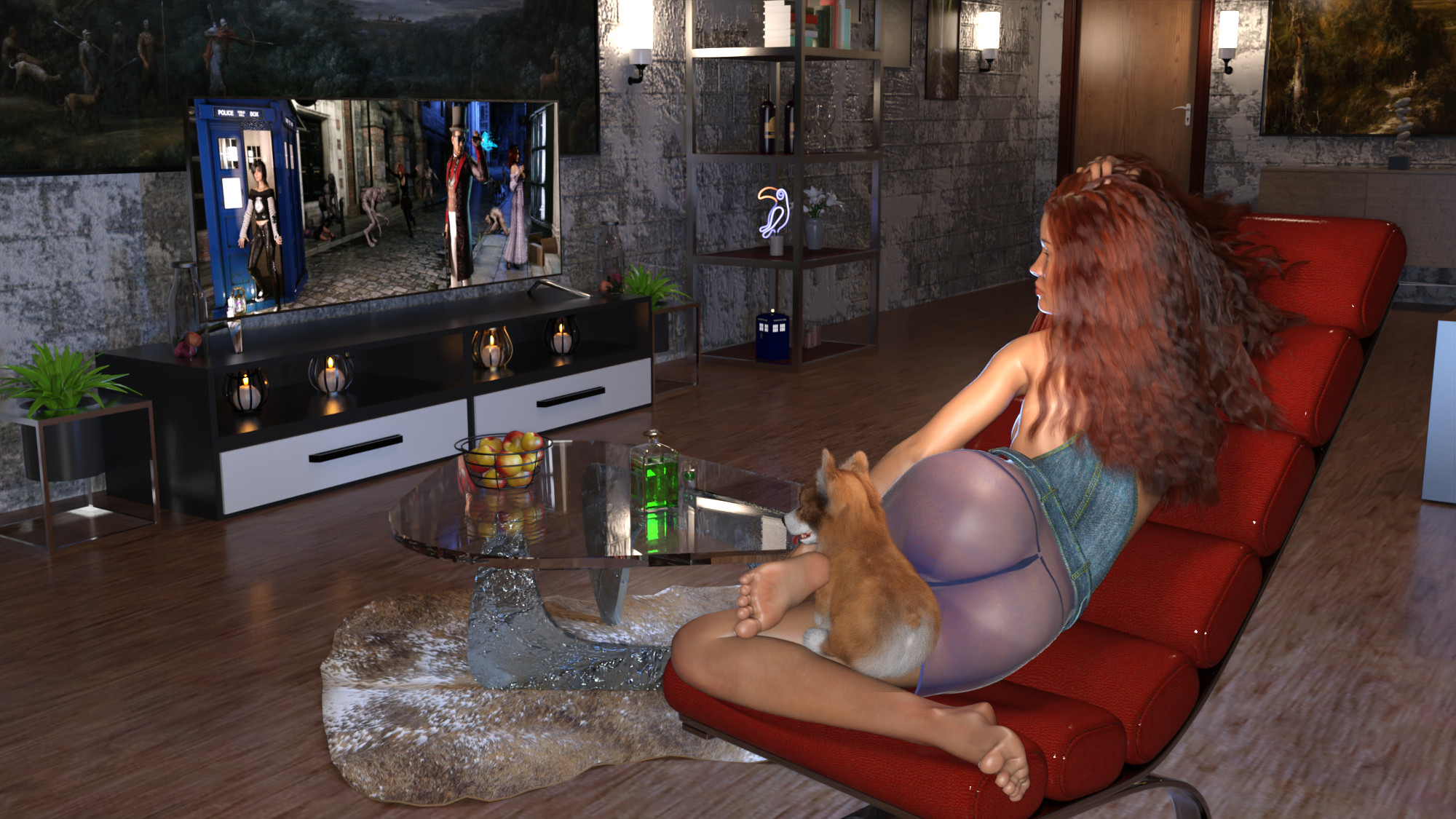 Die Haut ist ein wenig zu "Glanzvoll"! Starke Stimmung in einem sehr schön eingerichteten Wohnzimmer.