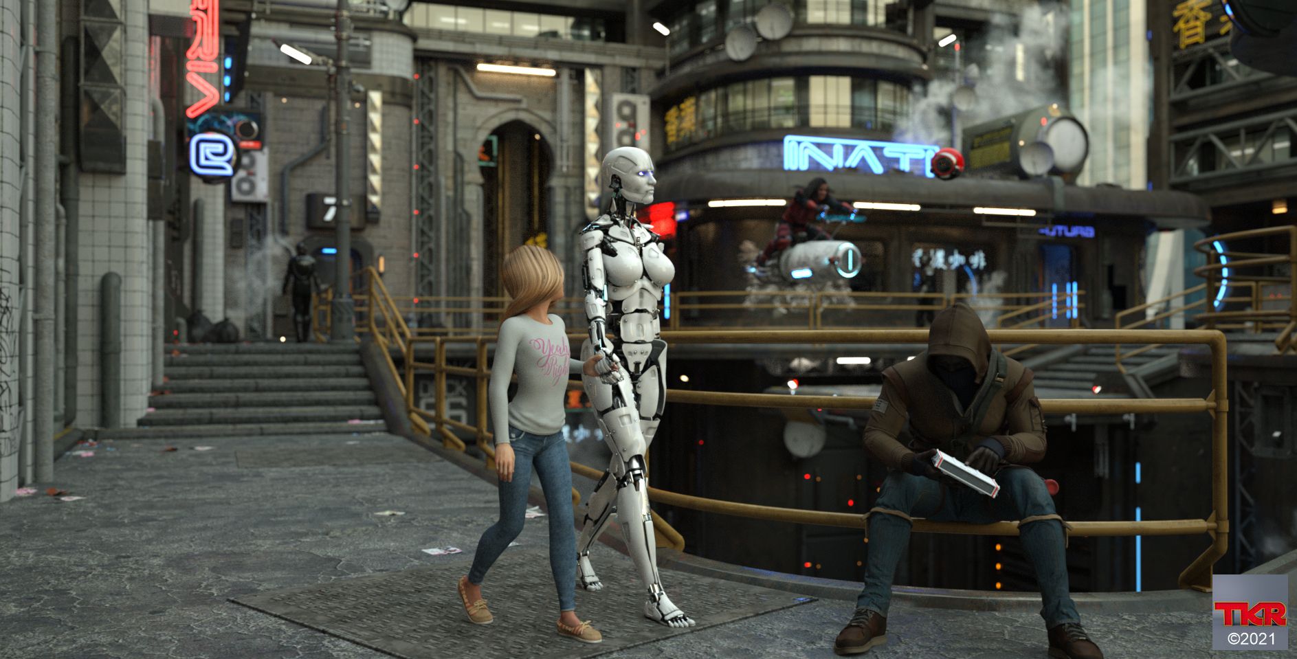 Sieht so unsere Zukunft aus? Androiden als Kindermädchen, Drohnen die uns beobachten und Müll auf den Straßen.