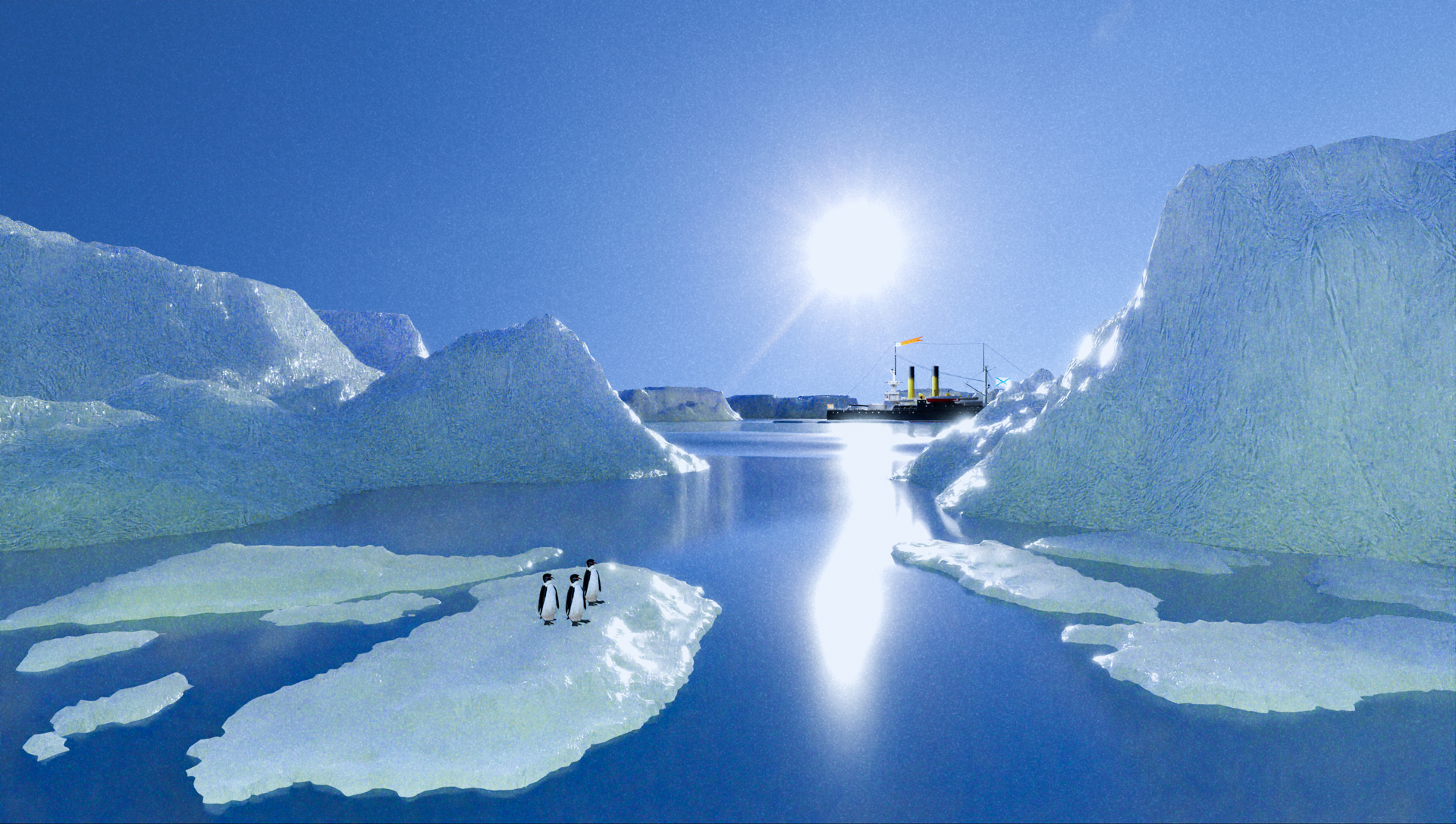 Hier sehen wir den Rettungskreuzer MS "Pengü" beim Aufspüren verirrter Pinguine. Vorbildlich ist der Antrieb des Schiffs, da man trotz klirrender Kälte keine heißen Wolken sieht, weil es sich bei den Schornsteinen um Windrotatoren handelt. Das einzige Schmiermittel welches die Lager dieser Maschine noch benötigen, stammt aus klimaneutraler Landwirtschaft und kaltgepresstem Öl, welches nebenbei auch in Pfannen der Kombüse zum Braten und Frittieren genutzt und wiederaufbereitet wird.