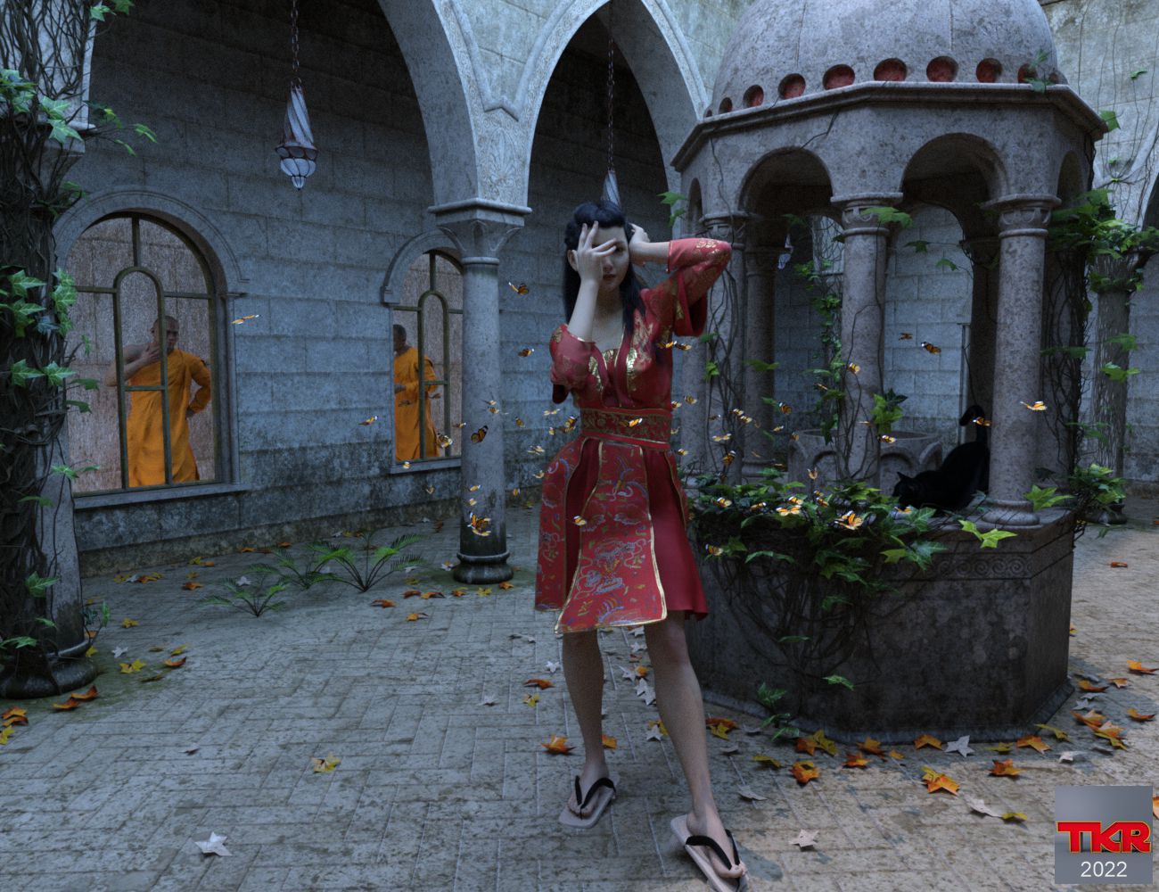 Eine wilde Mischung, ein Europaisches Klosten mit Buddistischen Mönchen und einer erotischen Frau, die Schmetterlinge anzieht :)) Hat man nicht jeden Tag