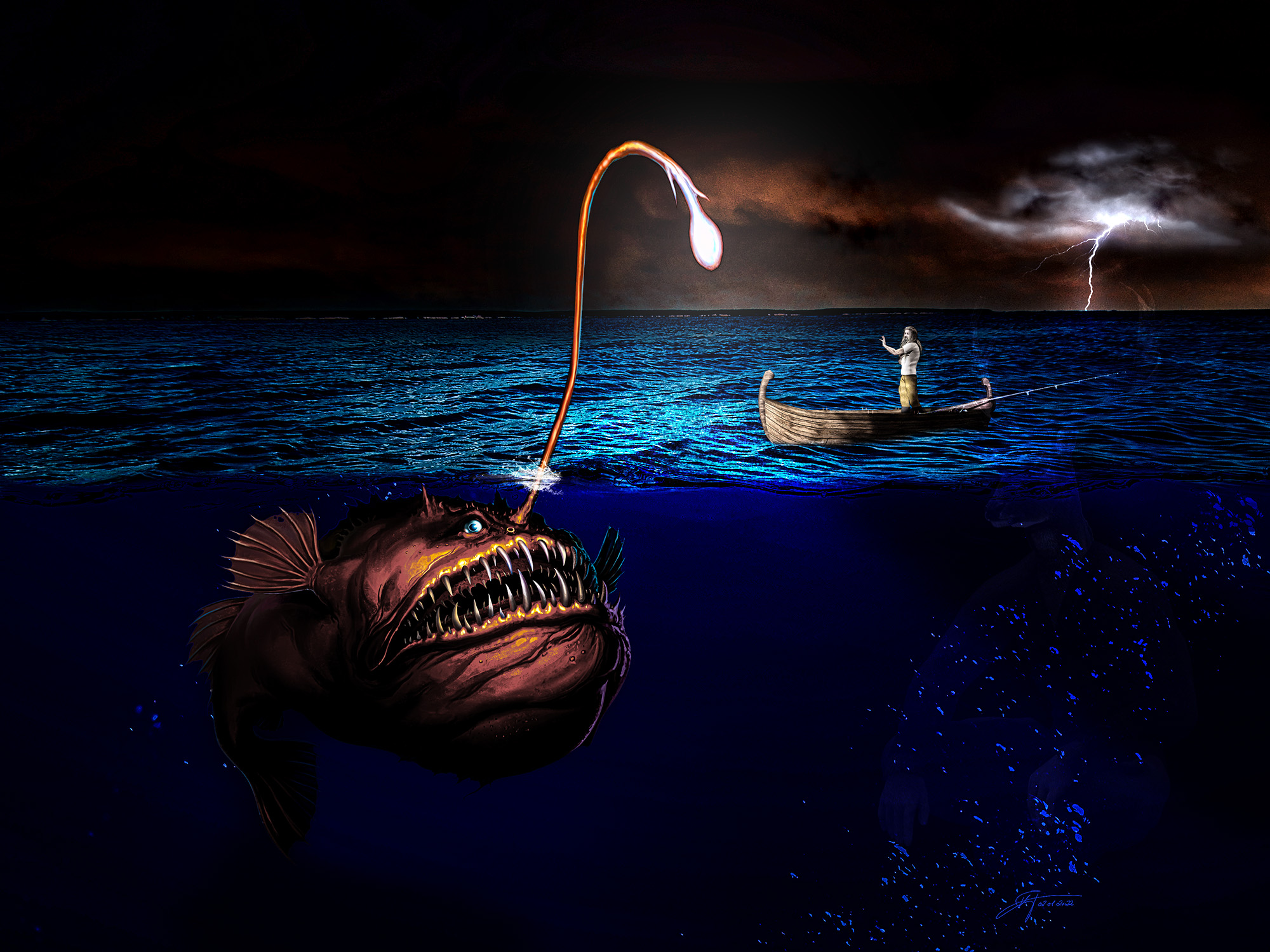 *GRINSE* Da steckt durchaus eine Wahrheit drin, denn wenn man einen Tiefsee-Laternenangler an die Oberfläche holt, bläht er auf wie ein gestresster Kugelfisch ... und platzt wie ein überfüllter Luftballon.