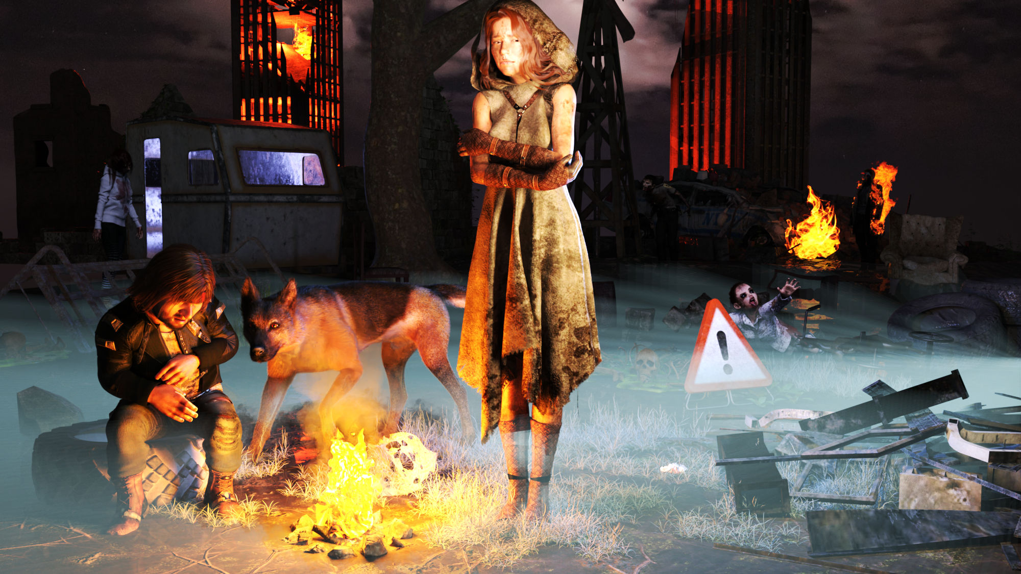 Auf der Suche nach etwas Essbarem begegnete der Halbling einer weiteren Überlebenden. Sie sprach kein Wort und schien bis ins Mark verängstigt zu sein. Vorsichtig stellte sie sich an sein Lagerfeuer und suchte dessen Wärme, während der Schäferhund die Umgebung im Auge behielt.