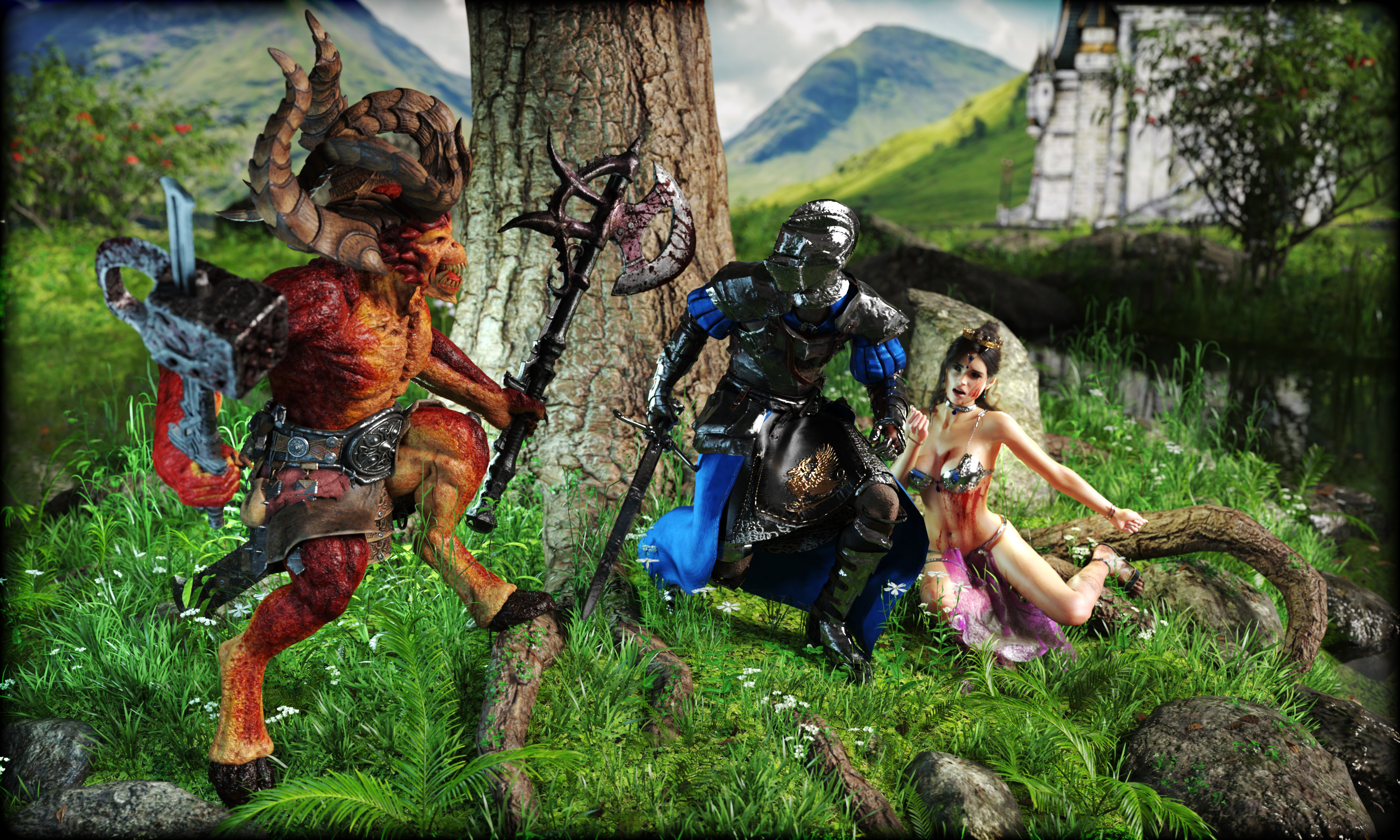 Der Dämon sieht aber schon recht angefressen aus - also sollte sich der Ritter vielleicht fragen, ob die Dame wirklich eine unschuldige Prinzessin ist oder vielleicht ein Vamp, der Dämonen zum Frühstück frisst und sich grad köstlich amüsiert.