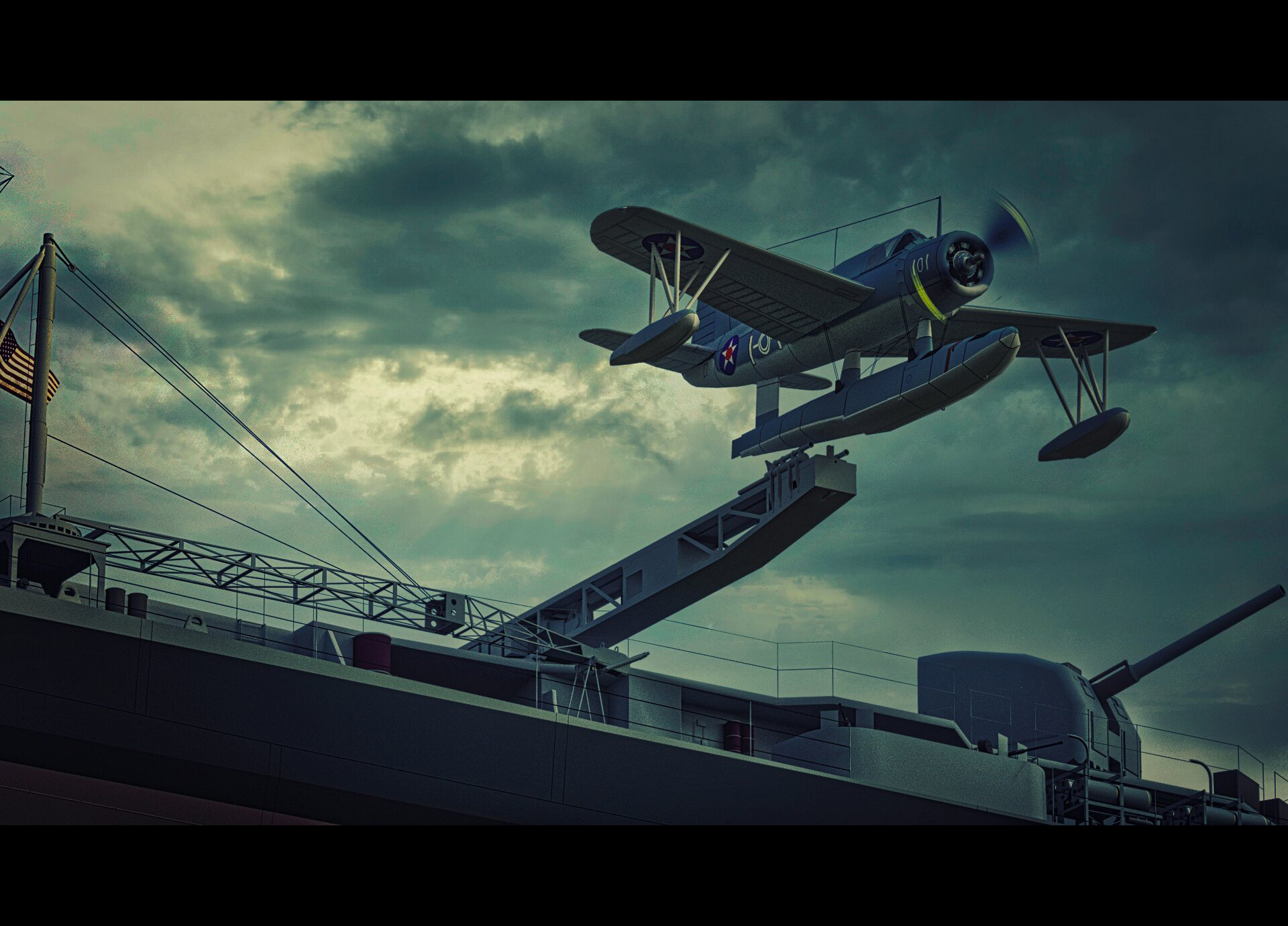Das Hammer-Modell der USS Stevens in einer kleinen Action-Szene gerendert. Start des Bordflugzeuges.