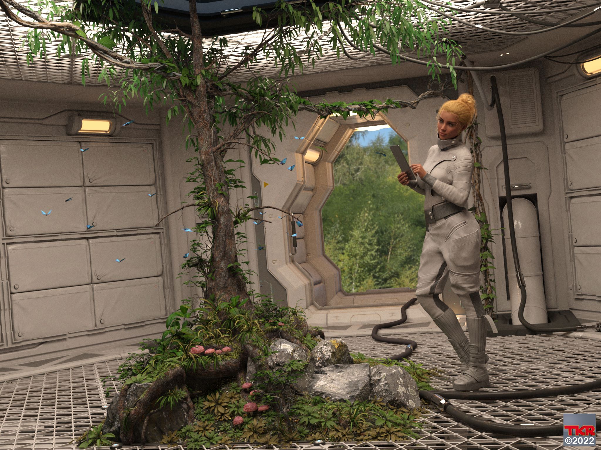 Oder noch verrückter: Der Baum ist der biologische Schiffscomputer (erkennbar an den dicken Kabelsträngen) und die Dame ist eine Biotechnikerin oder Bioinformatikerin.
