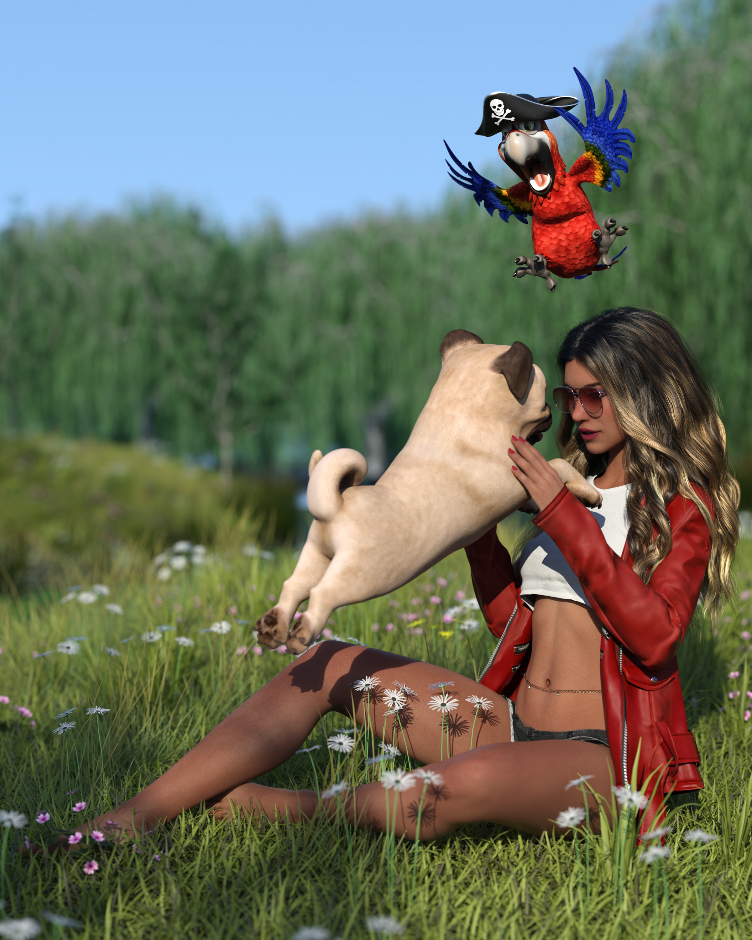 Bei dem schönen Wetter gehen Maika und Puggy gerne in den Park. Am See sind schöne Wiesen und es gibt hier auch Papageie ![]()