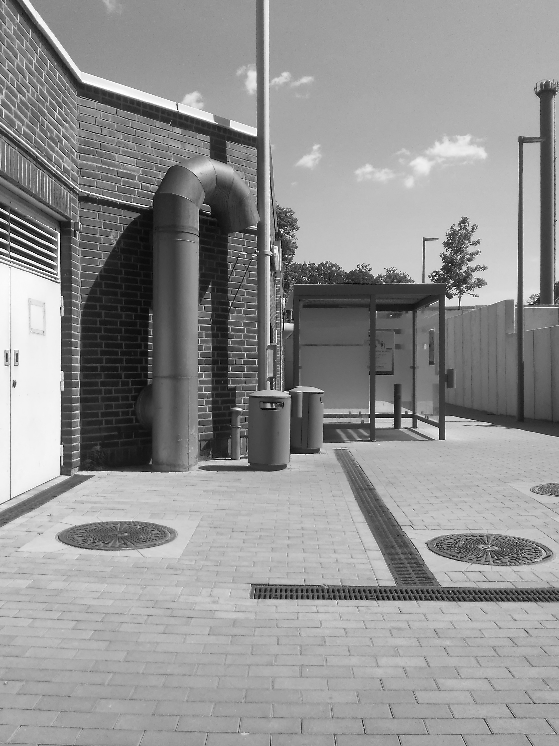 Ich finde das Foto auch interessant ob dem Zusammenhang Raucher-Häuschen und Krematoriumskamin in einem Bild. Das hat was!