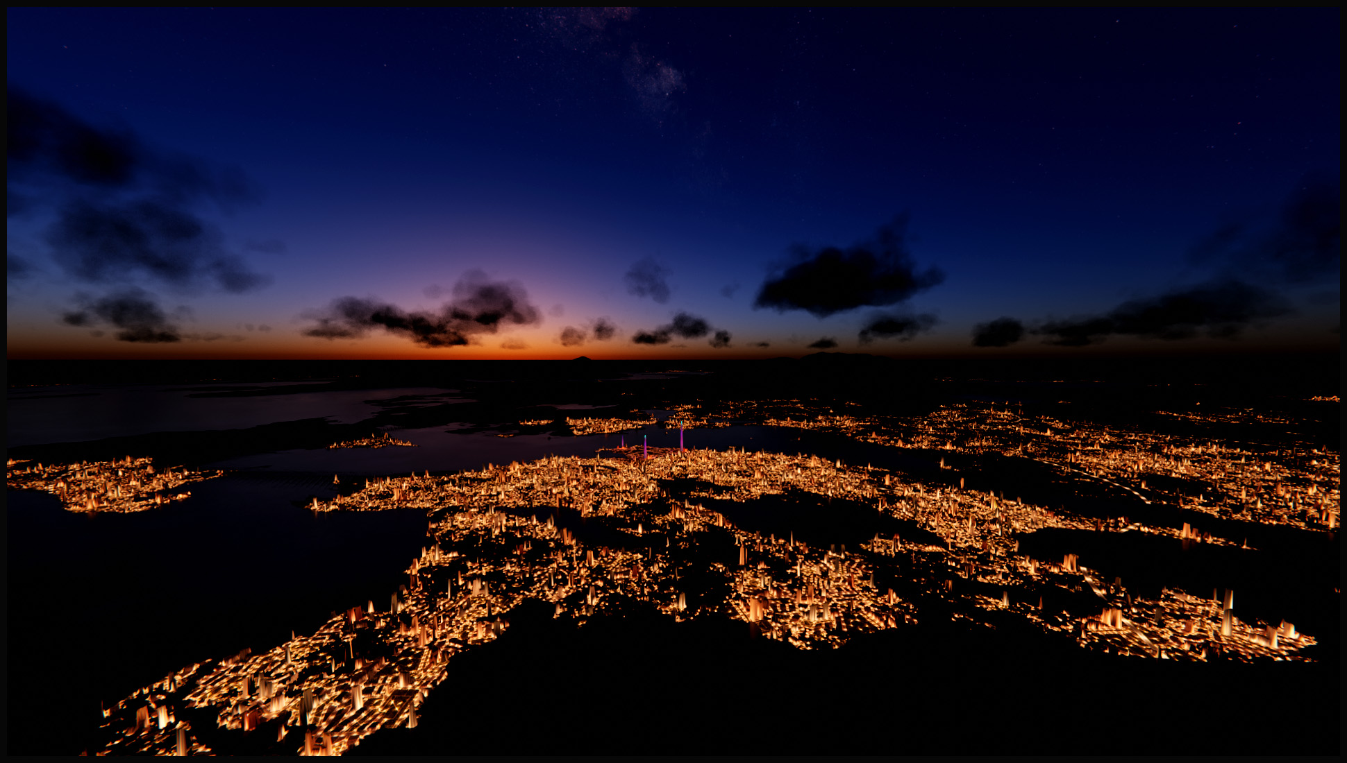 . Sehr warme Lichter für eine große Stadt. Auf einen ersten schnellen Blick könnte man es auch als Waldbrand sehen.