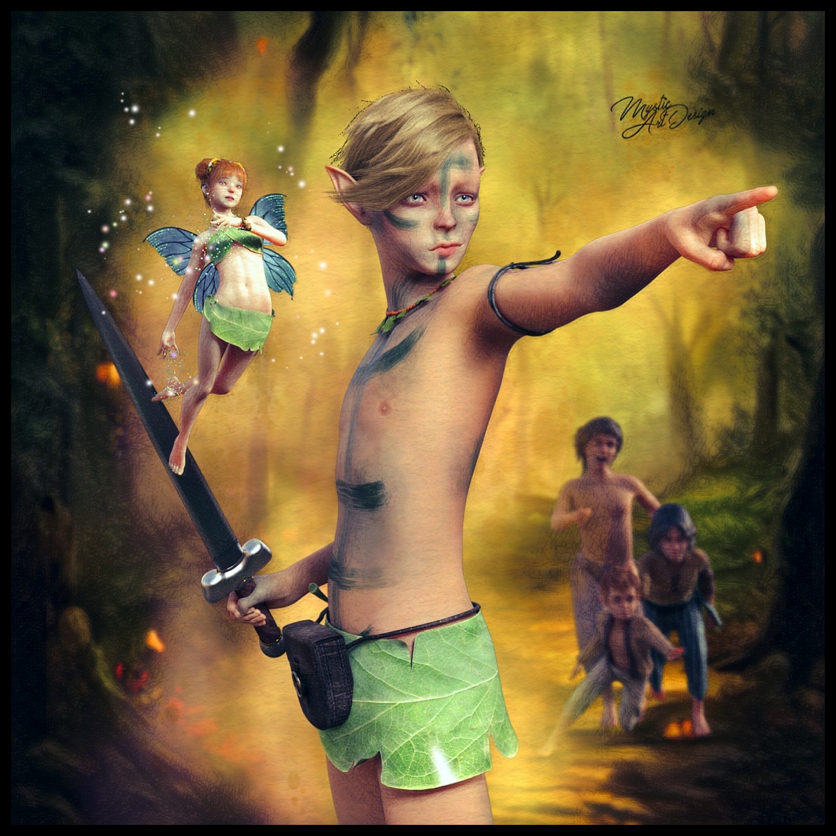 Peter Pan als Elfenjunge?! - Das ist mir neu. - Und der sieht mir auf dem Bild viel zu erwachsen aus, was er aber doch nie werden will.
