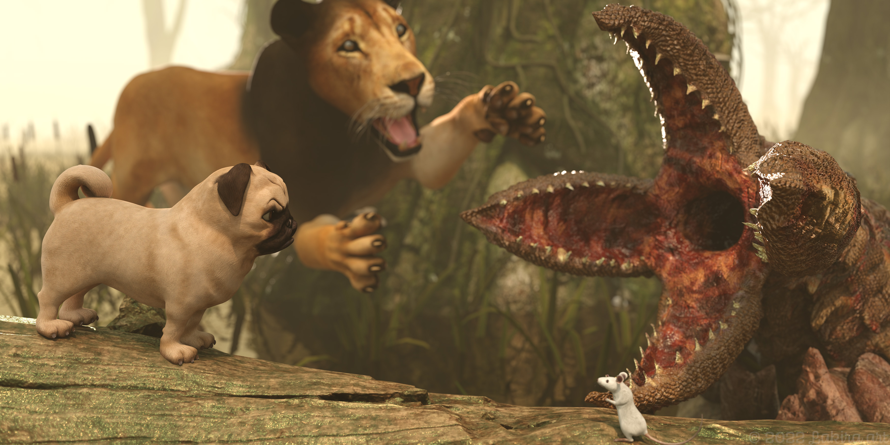Naja, und Puggy ist wirklich ein Held: Guckt die Maus böse an und achtet nicht auf das komische Monster.