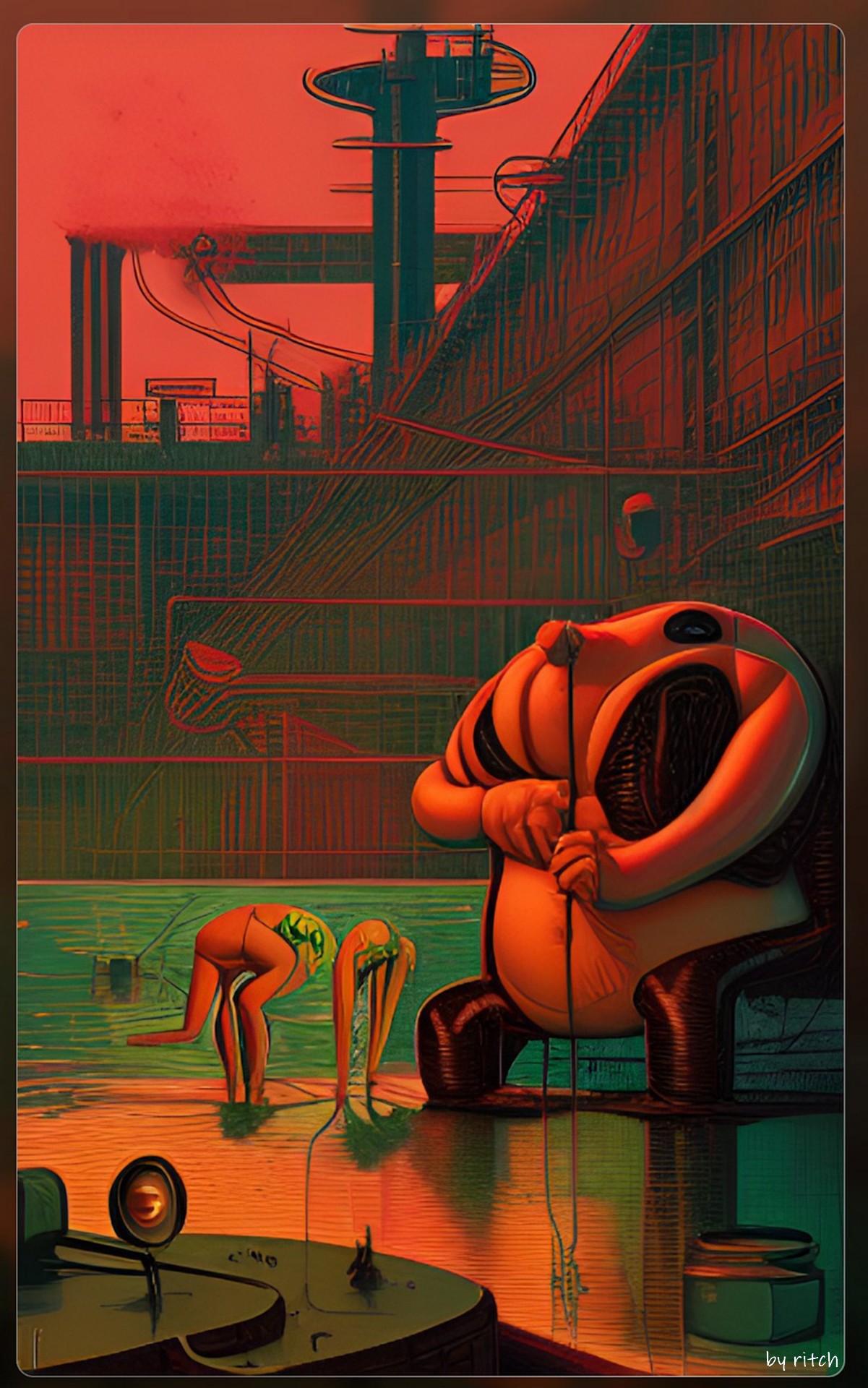 Ein normaler zukünftiger Abend. Die dreiäugigen Kanalratten beißen gut - die Mutationen der Fischerinnen halten sich ebenfalls in Grenzen. Diesmal sogar ohne Atemschutzmasken und Gummianzüge. Der Bot bewacht die Mädels, denn hinter den Mauern des alten Industriegebäudes lauern noch ganz andere Gestalten. ![]()