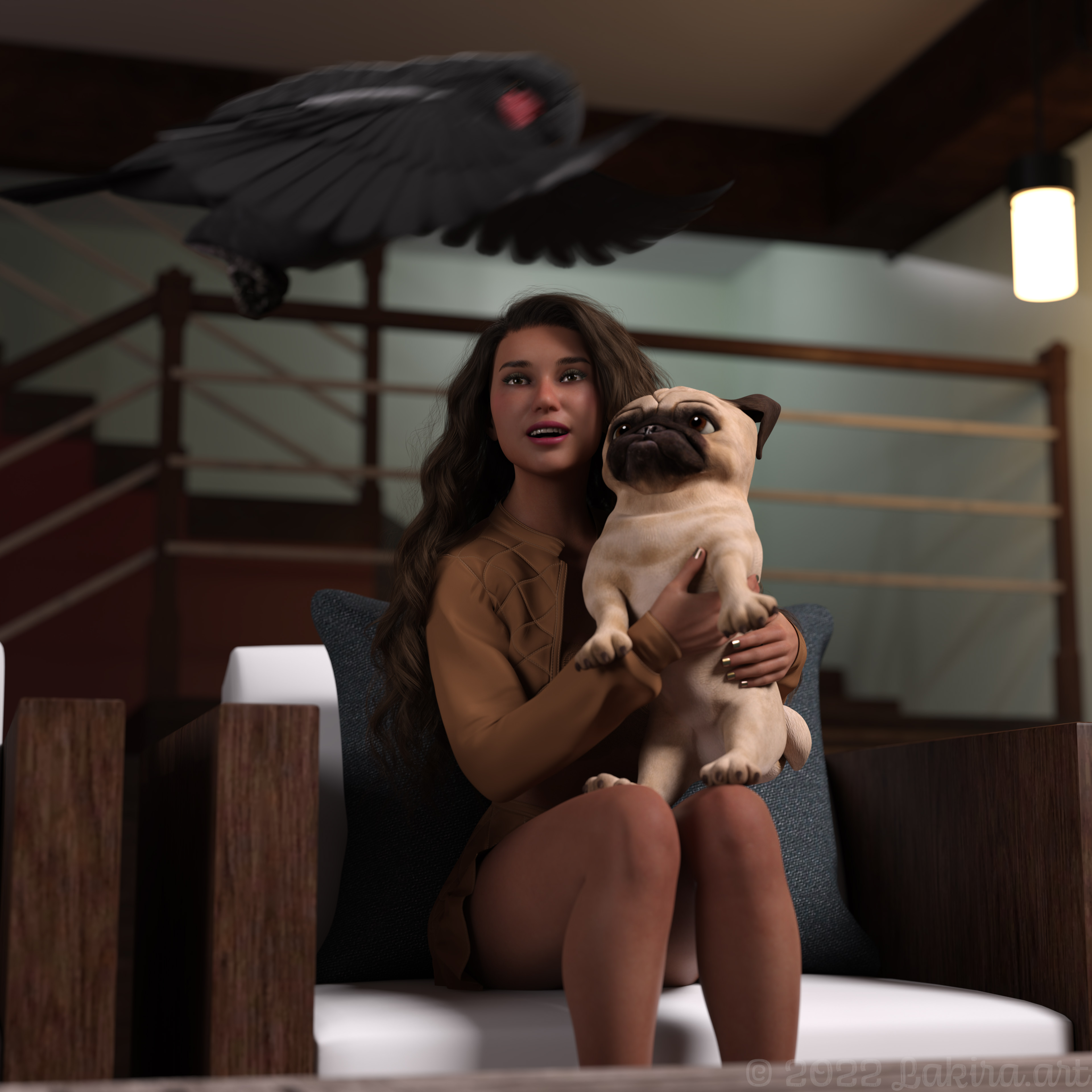 Anstatt Coco zu jagen, staunt er über die klasse Flugkünste des Papageis. So groß und so gut im Fliegen.