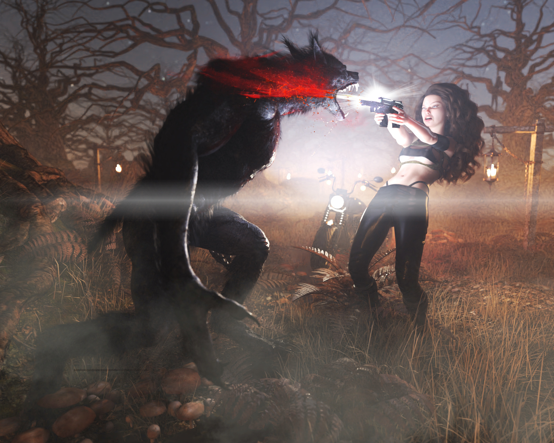Das haut mich glatt vom Hocker. Superschönes Bild mit Nebel, Scheinwerfer und Blut das tüchtig spritzt. Der Werwolf ist fantastisch.