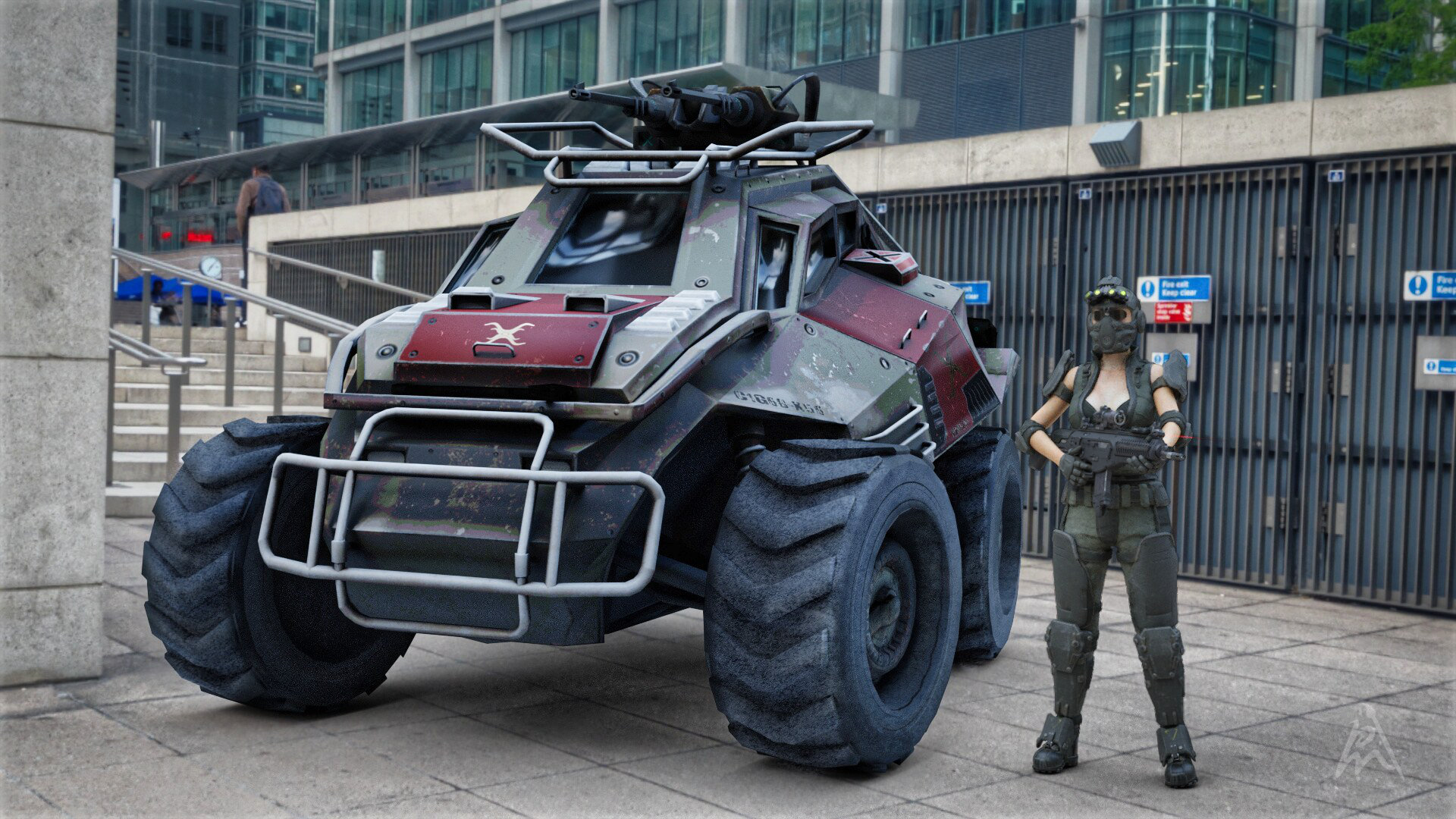 Blender Cycles Render kombiniert mit ein Daz Studio Iray Render. Das Fahrzeug ist ein Poser Model das ich in Blender importiert habe und da mit den Shader Nodes versucht habe einen realistichen look hin zu bekommen. Die Umgebung ist ein HDRI im Cycles render. Die Dame habe ich in Daz Studio hin gebogen und ein Render gemacht. Letztlich beide Render im Foto Editor kombiniert.