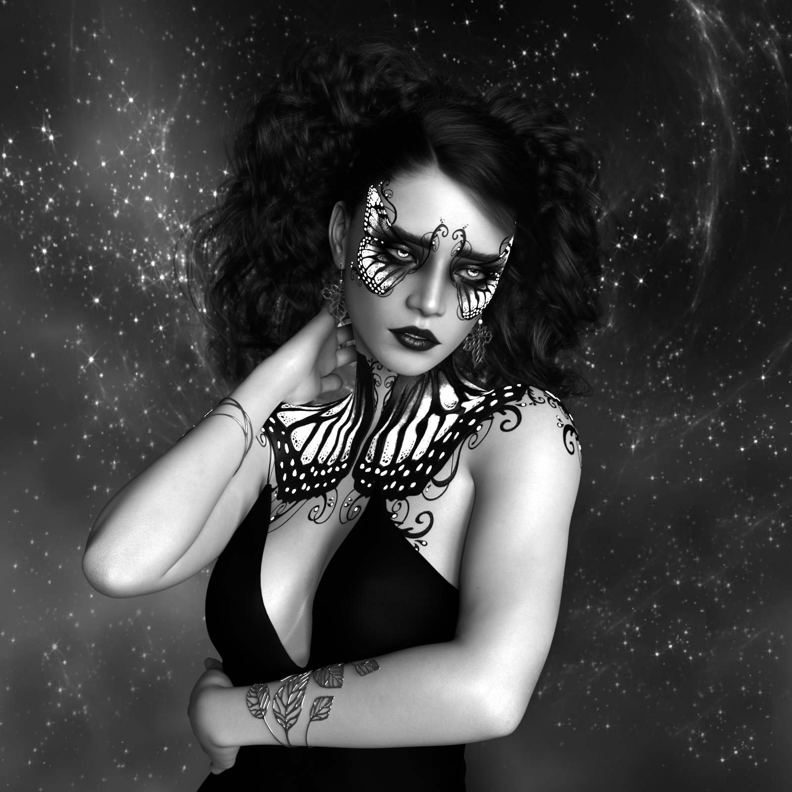 Bin mir nur gerade nicht sicher, ob mir das Bild wirklich gefällt, oder einfach nur irgendwie faszinierend ist. Speziell diese Schmetterlingsflügel an den Augen wirken wegen der schwarz/weis-Darstellung auf mich so, als ob nicht so wirklich klar ist, ob die jetzt auf die Haut gemalt sind, oder ob es sich dabei um überdimensionale Wimpern handelt?