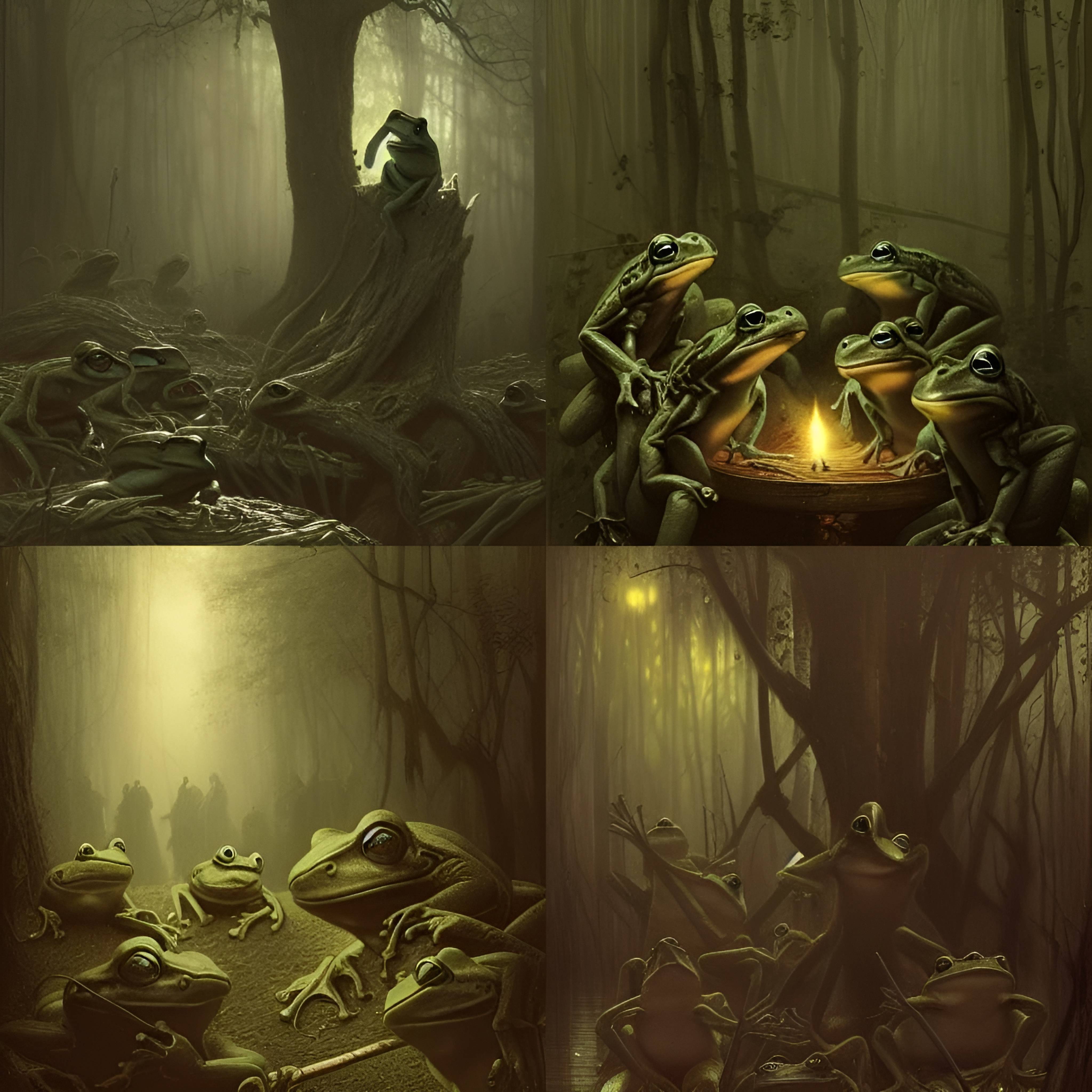 Dumm sind diese fiktiven Frogs jedenfalls nicht, denn sie haben das Feuer, wie man sieht, bereits "gebändigt". "Normale" Tiere waren dazu nie in der Lage - egal ob Vegetarier oder Fleischfresser. Also scheint es irgendwas gegeben zu haben, das ihre Evolution vorantrieb. Eine komplexe Lautsprache, die auf Quak beruht, doch immer facettenreicher wurde ... bis hin zur Fähigkeit der Diskussion als Grundlage der verbalen gemeinschaftlichen Planung.