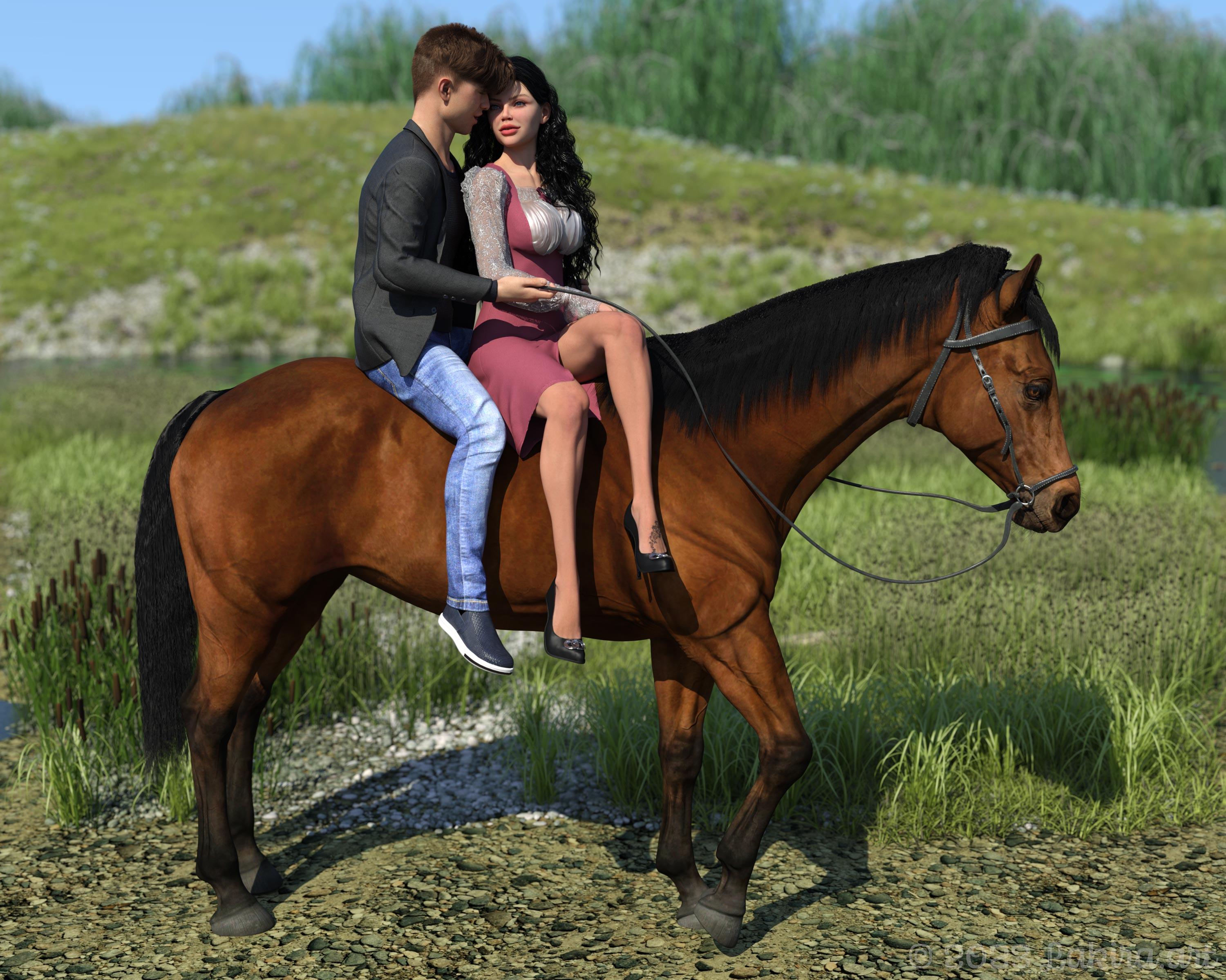 Eine junge Liebe reitet durch eine schöne Landschaft.