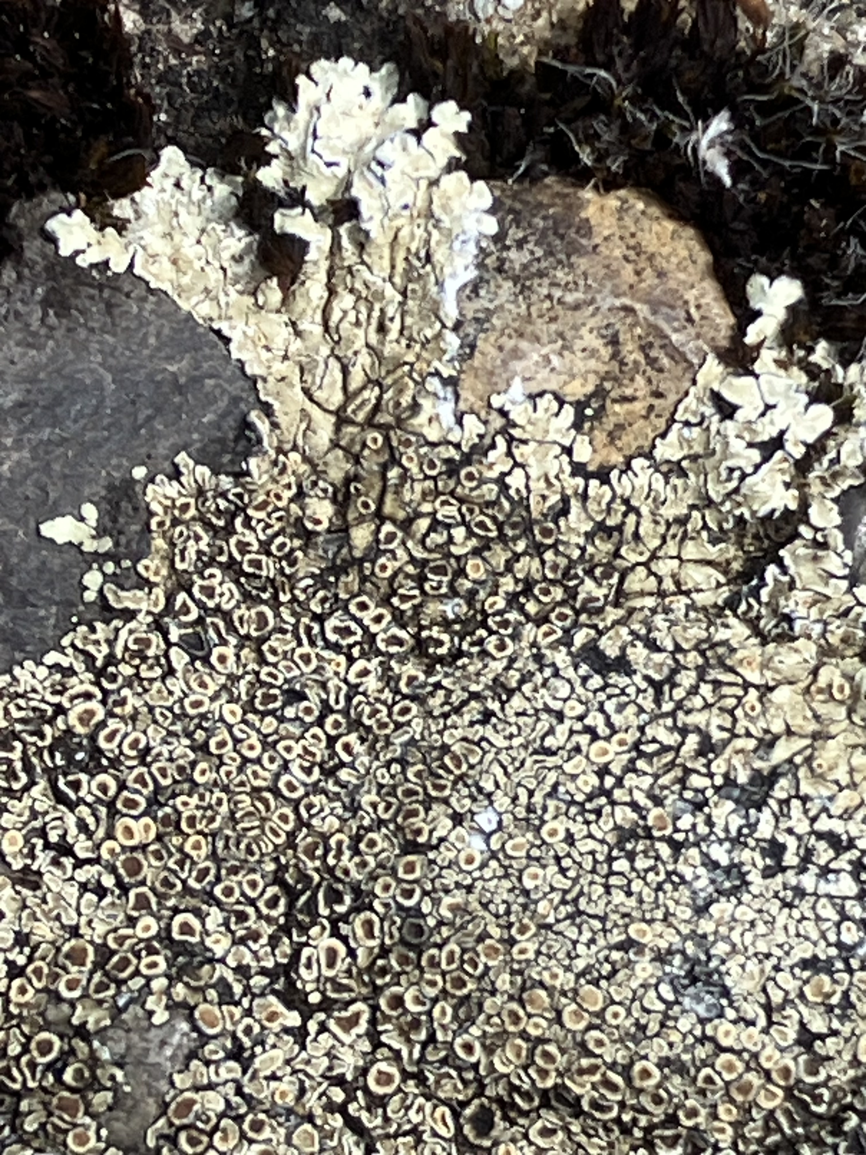 Die Flechte wächst auf der Abdeckplatte der Umrandungsmauer. Hab' heute die Flechte gegossen