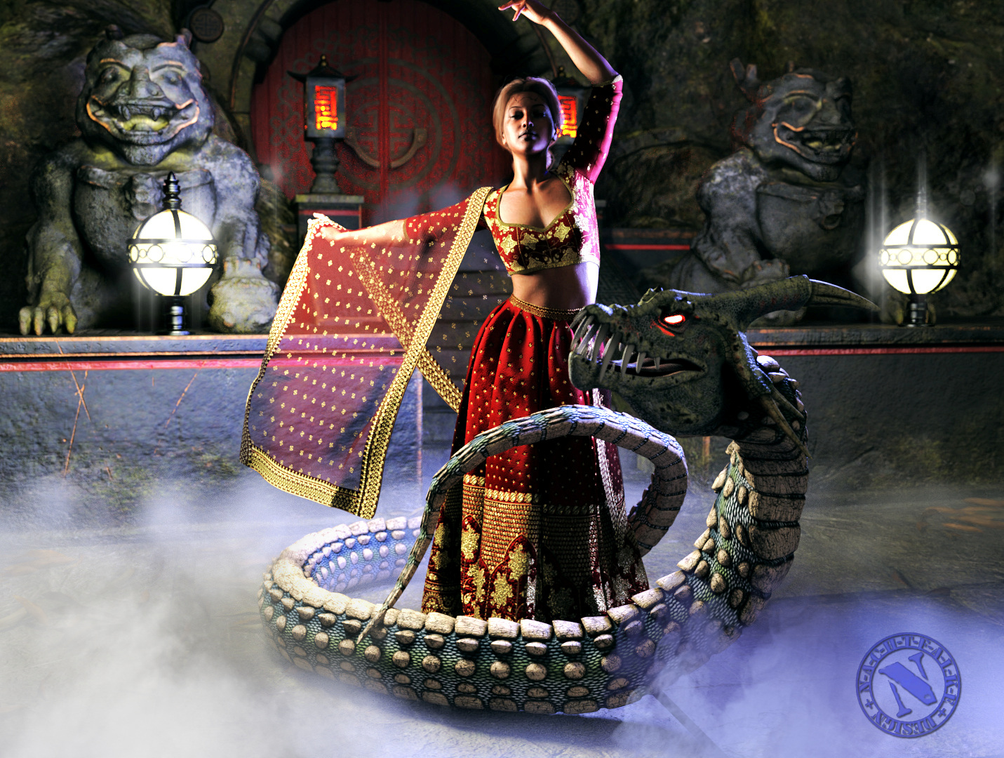• Ich finde die Beleuchtung auch nicht perfekt. Der blöde Drache ist schon uralt und kein Iray, der hat etwas Ärger bei dem Beleuchtungskonzept gemacht :P